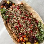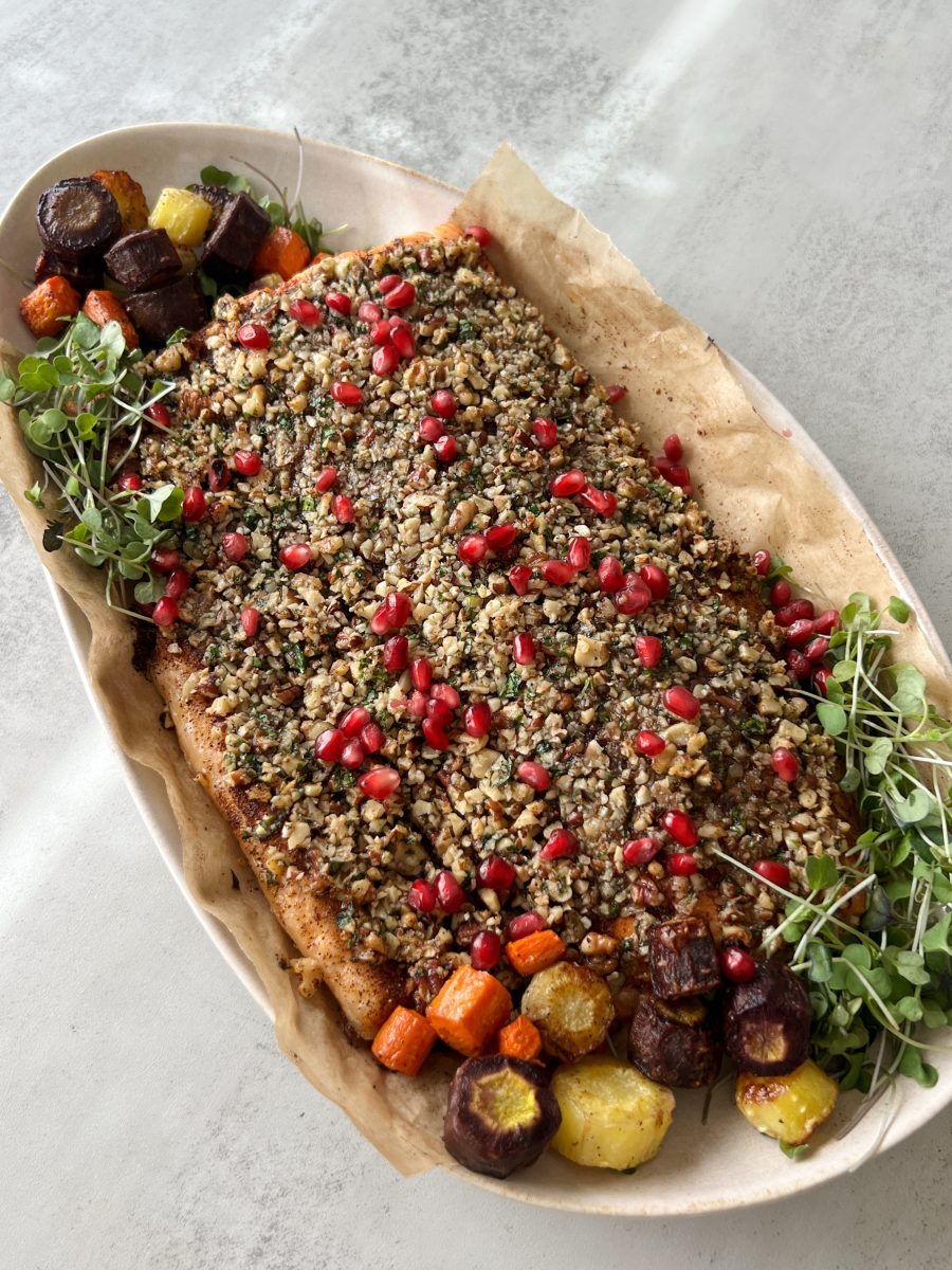 If you plan on serving this for a holiday dinner, I love adding a pop of color to the serving platter with roasted rainbow carrots, microgreens and pomegranate seeds. The flavors pair so well together while creating an eye-catching entree that’s flavorful and packed with omega-3 fats.