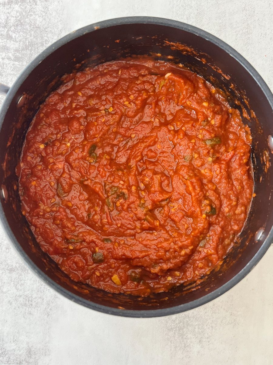 Traditionally, this recipe is made using fire-roasted bell peppers and hot peppers. I skipped the bell peppers in this version, but left some guidance on how to incorporate them in the recipe card below.