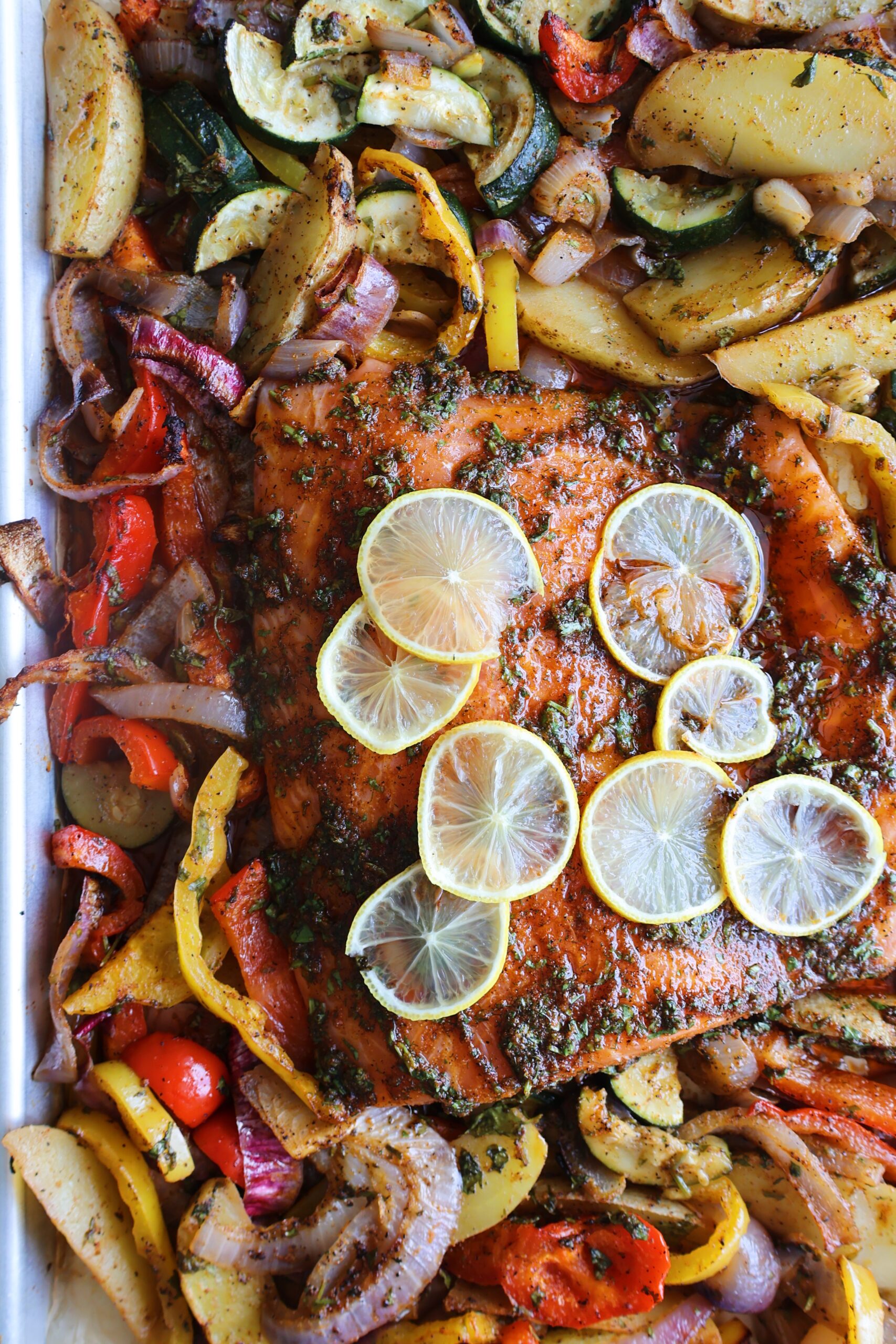 Potatoes, peppers, zucchini and onion get tossed in olive oil and a few spices then roasted until crisp. The salmon gets topped with a zesty marinade, then finished off on the sheet-pan with the veggies.