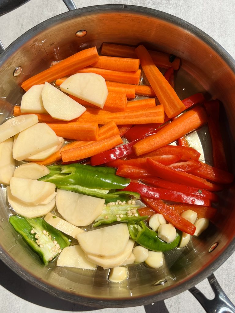 - Slice the bell pepper, carrots and green pepper to strips. Slice the potato into half and then into 1″ pieces. Cut each clove of garlic in half.