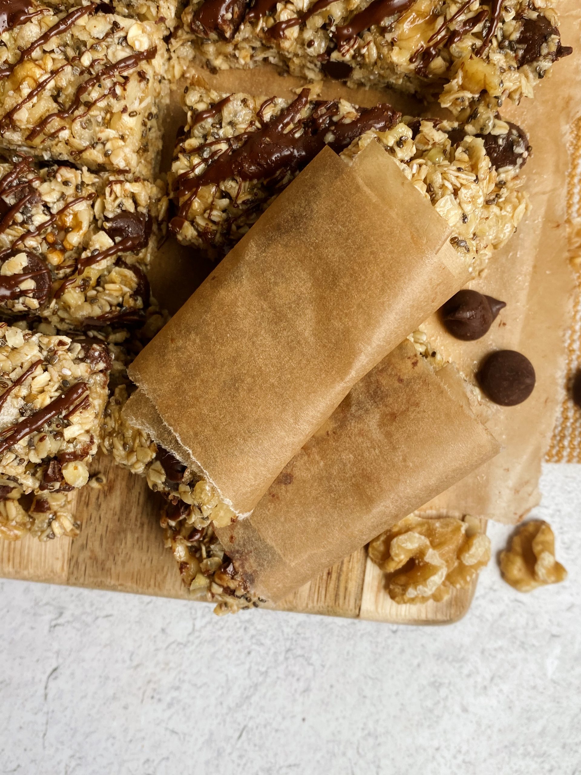 Most store bought bars are pretty simple and high in sugar. These dark chocolate and walnut granola bars are lightly sweetened, filled with good fats from the walnuts, tahini and chia seeds, and are a convenient snack or breakfast to have on hand.