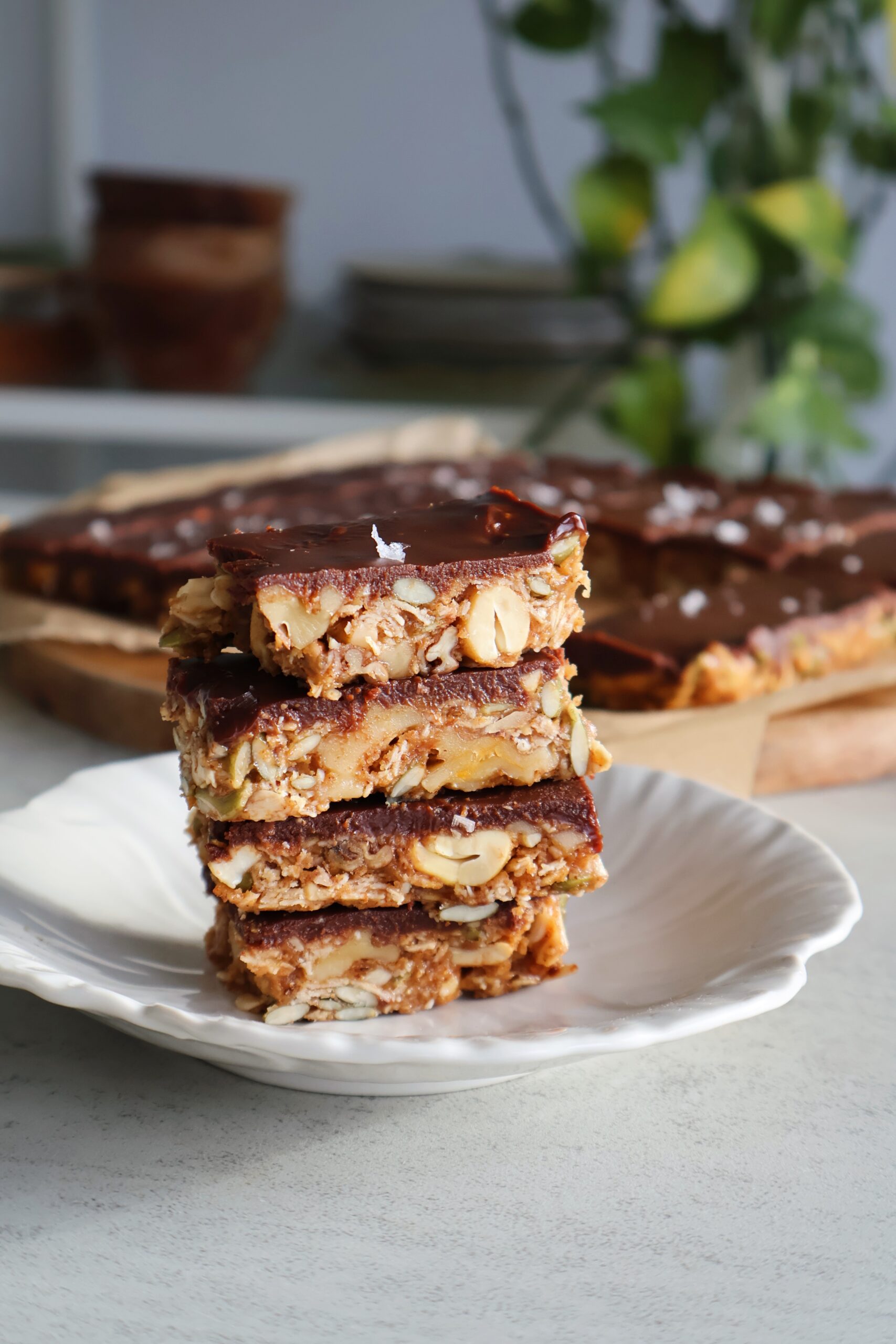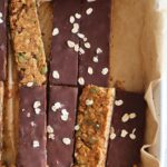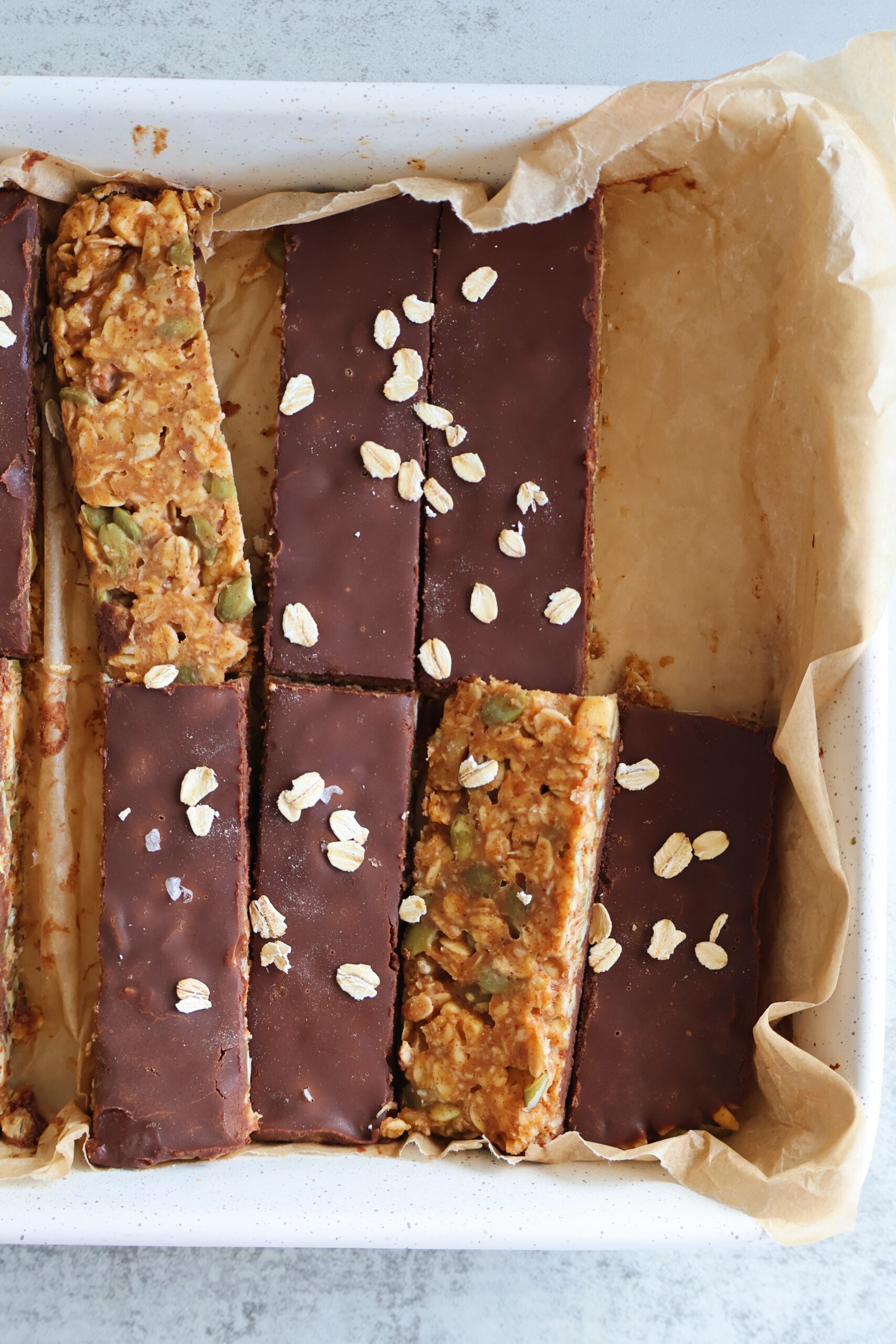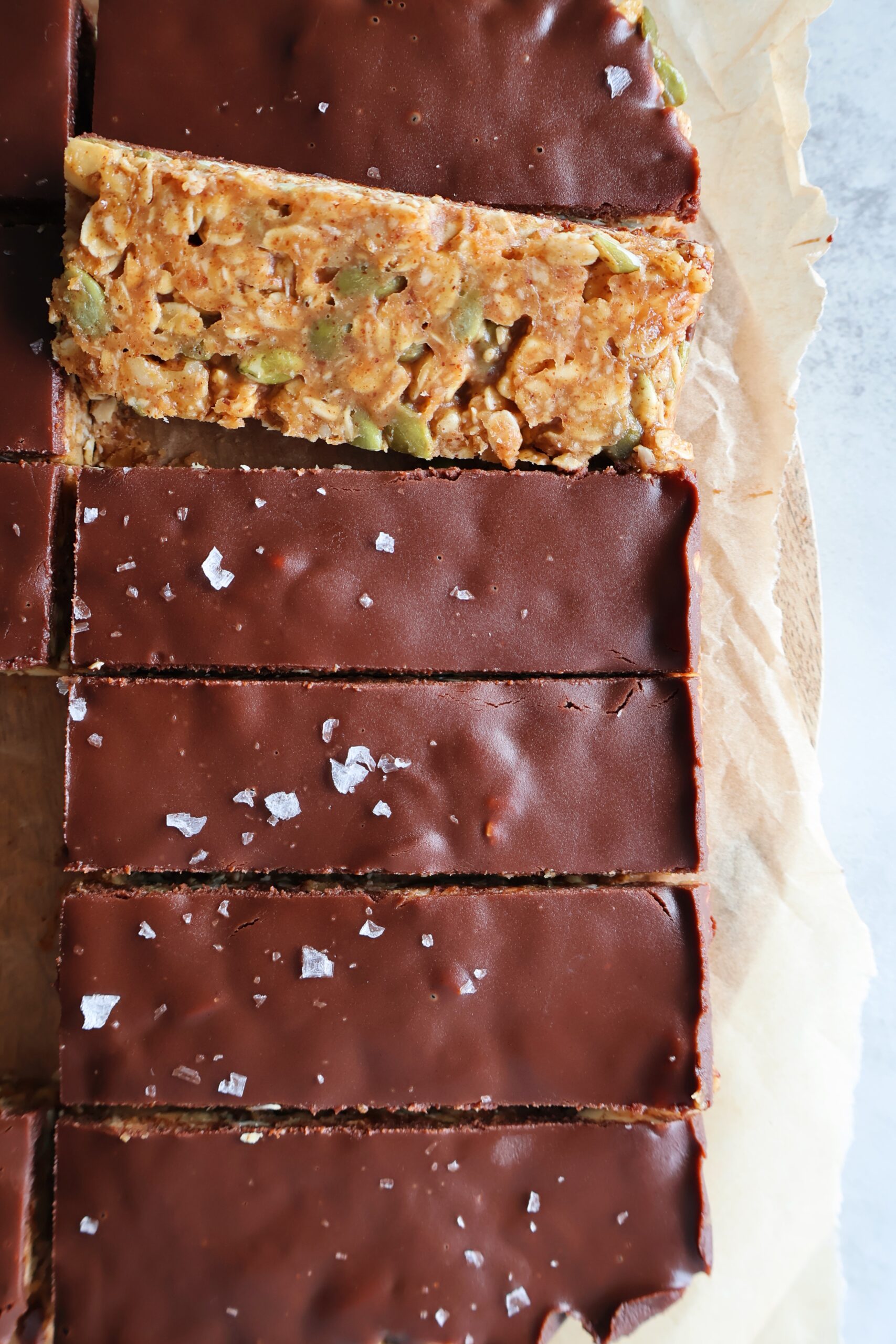 They’re made of rolled oats, a mix of nuts and seeds, shredded coconut, cinnamon and maple syrup. The bars are topped with a 2-ingredient chocolate ganache made of chocolate chips and coconut milk, and finished off with a sprinkle of flakey salt.