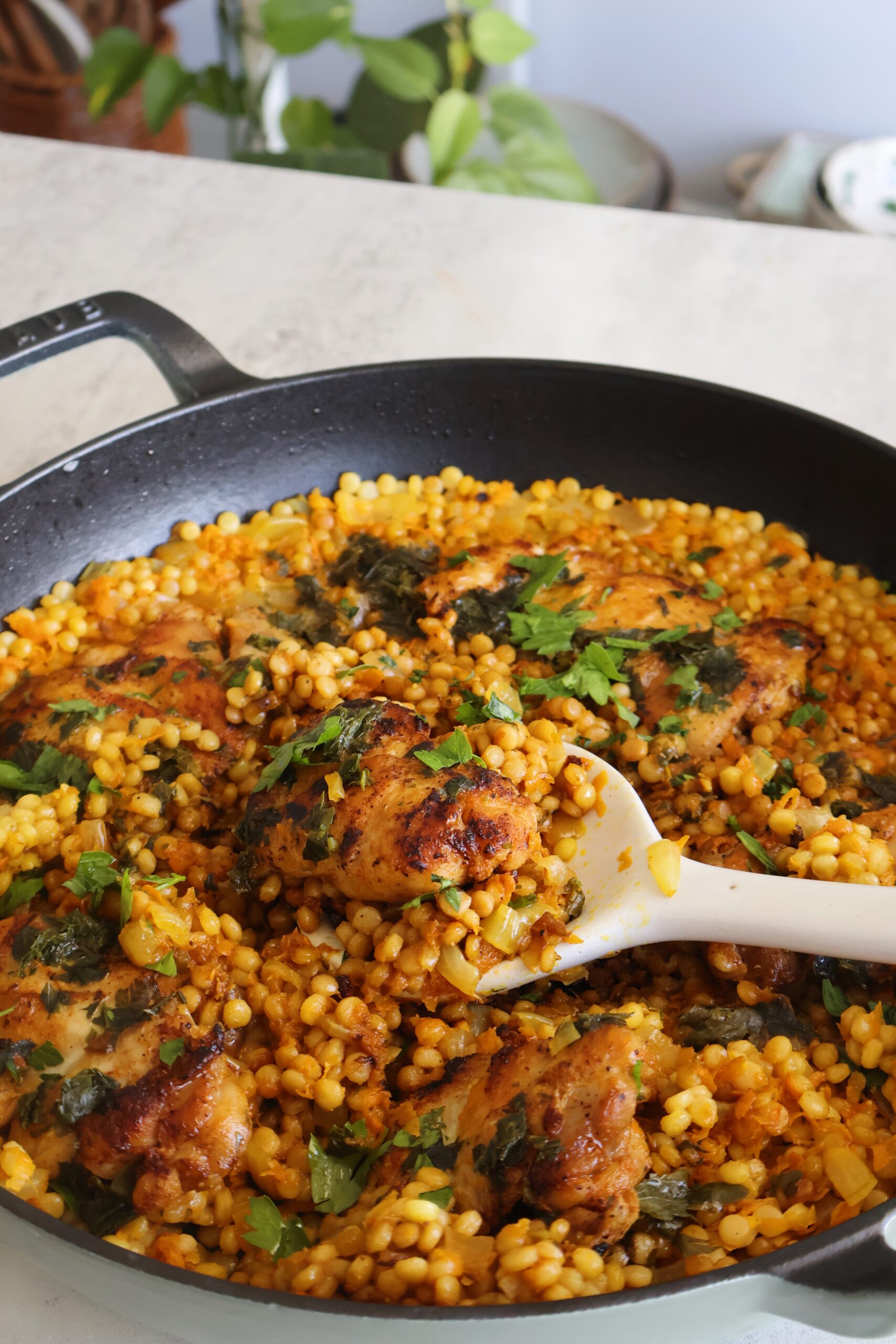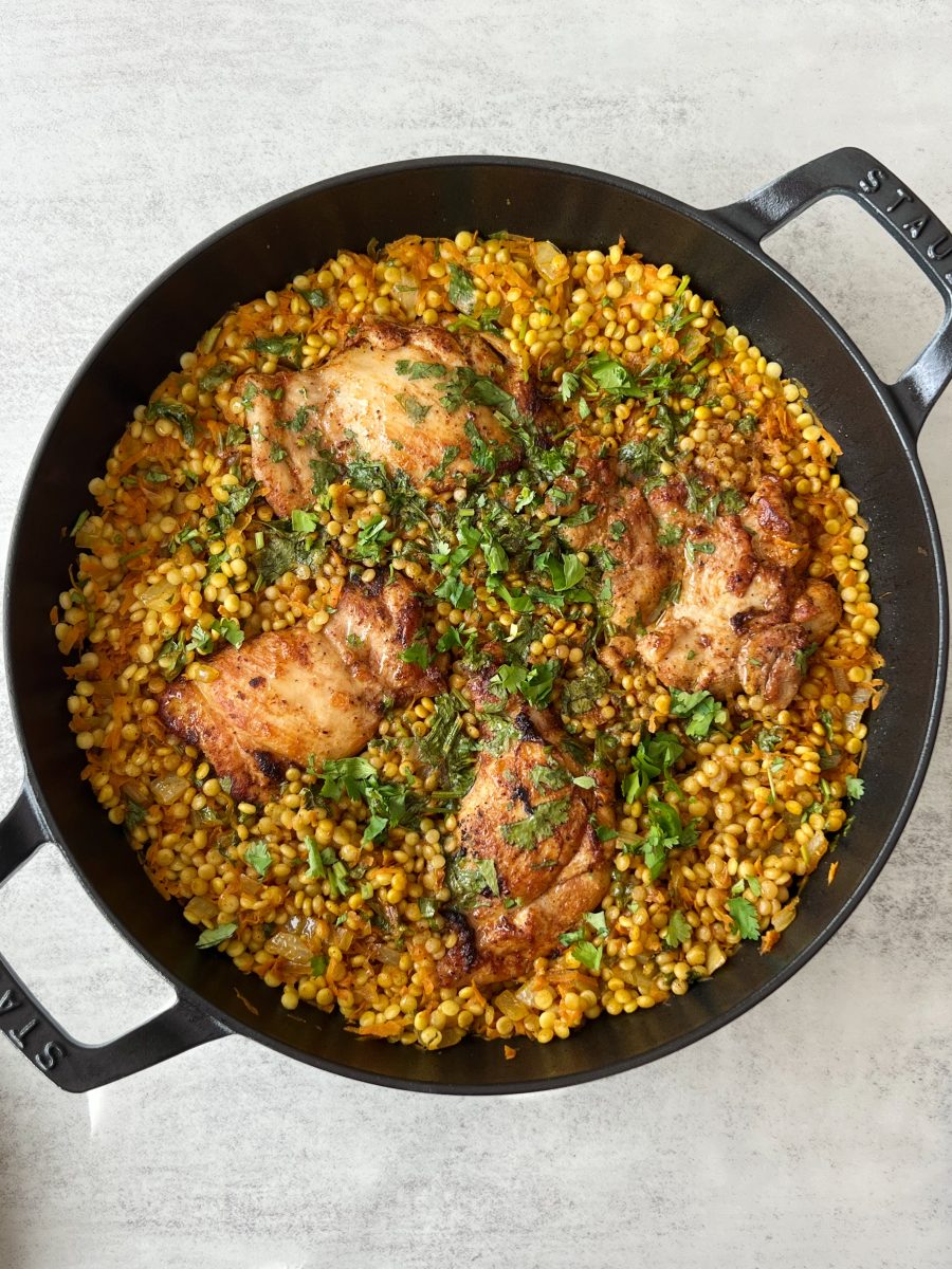 Easy weeknight meals don’t get any easier than a one-pan recipe. This skillet chicken and pearl couscous dish packs in protein, carbs and veggies all in one, and is a family favorite in our house.