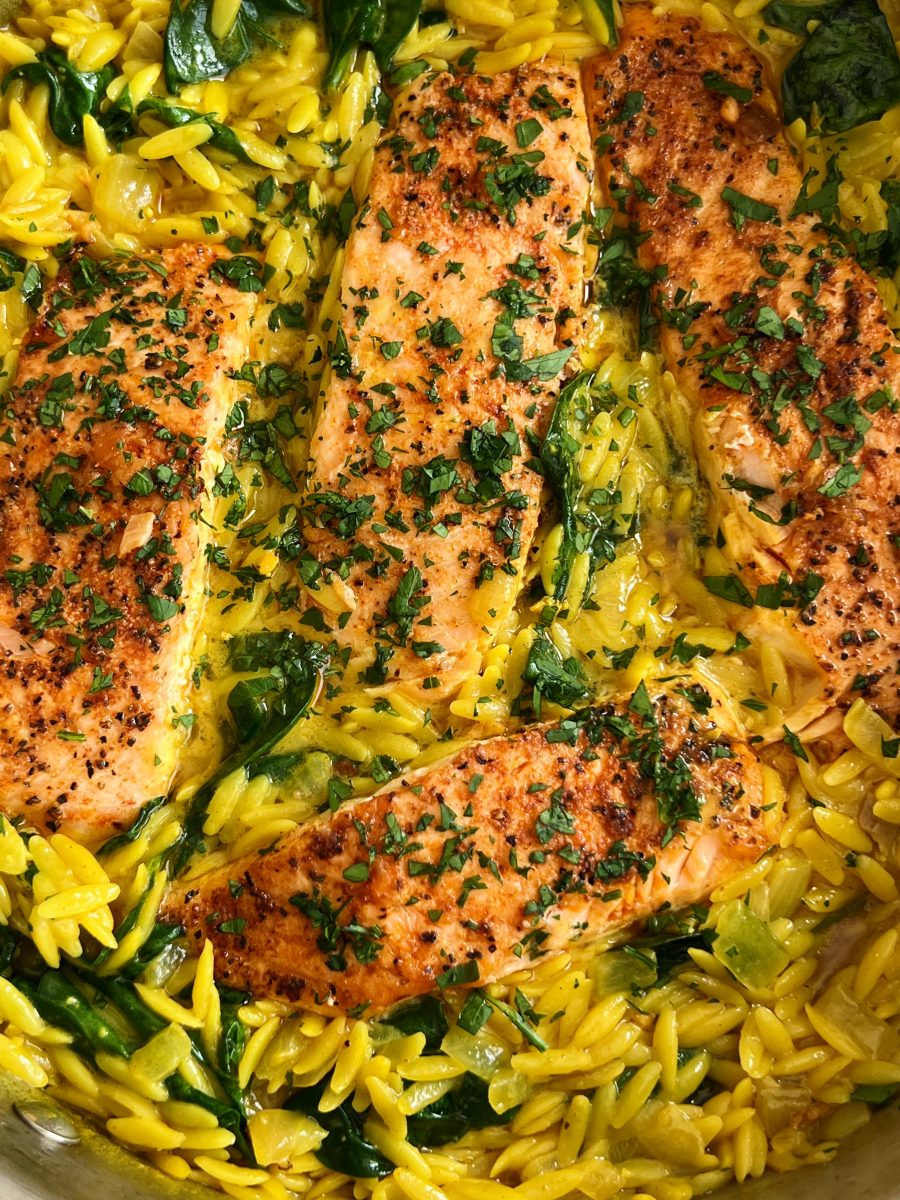 The salmon first gets pan-seared in a few spices, then finishes cooking in the orzo towards the end. The fish stays tender on the inside, with perfectly crisp edges.