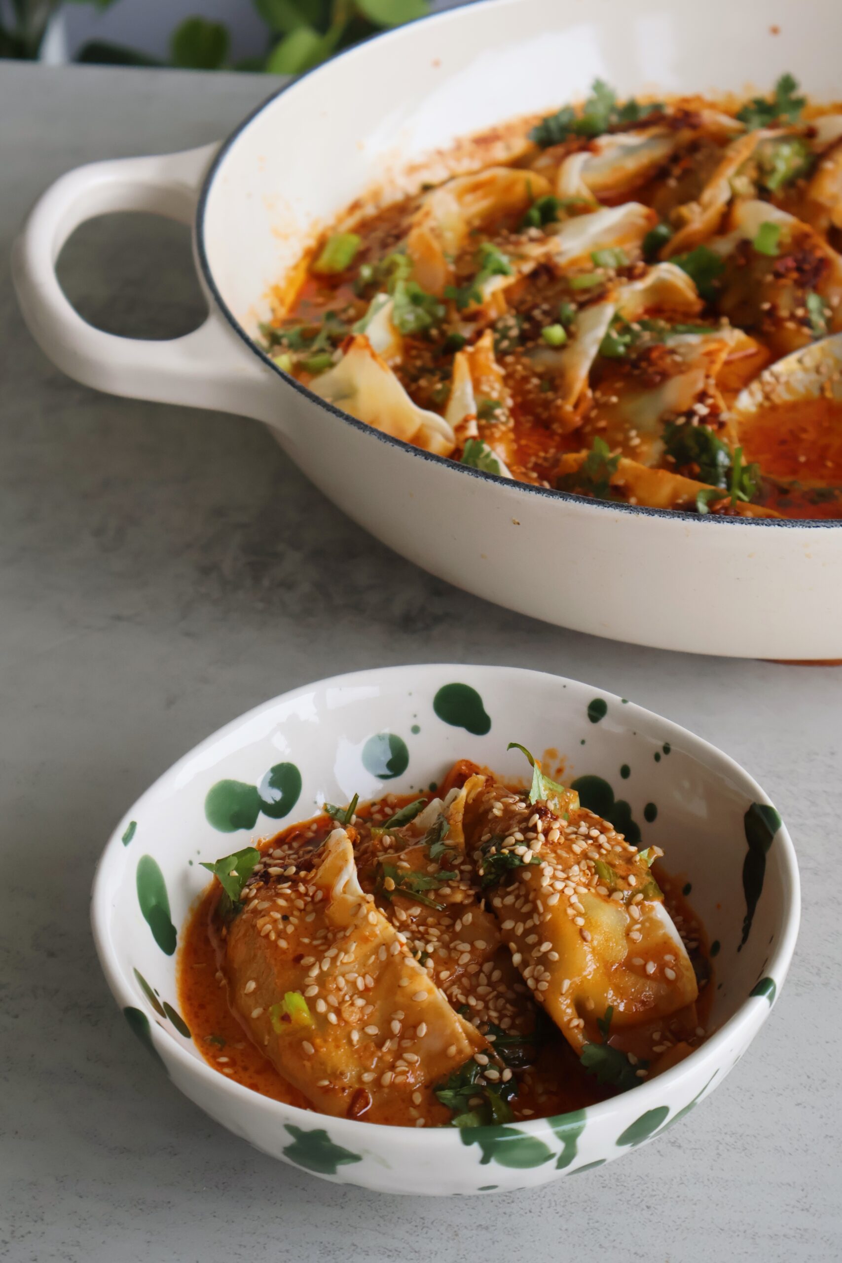 - Once the dumplings have softened, top with a drizzle of chili oil, chopped scallions, cilantro and sesame seeds.