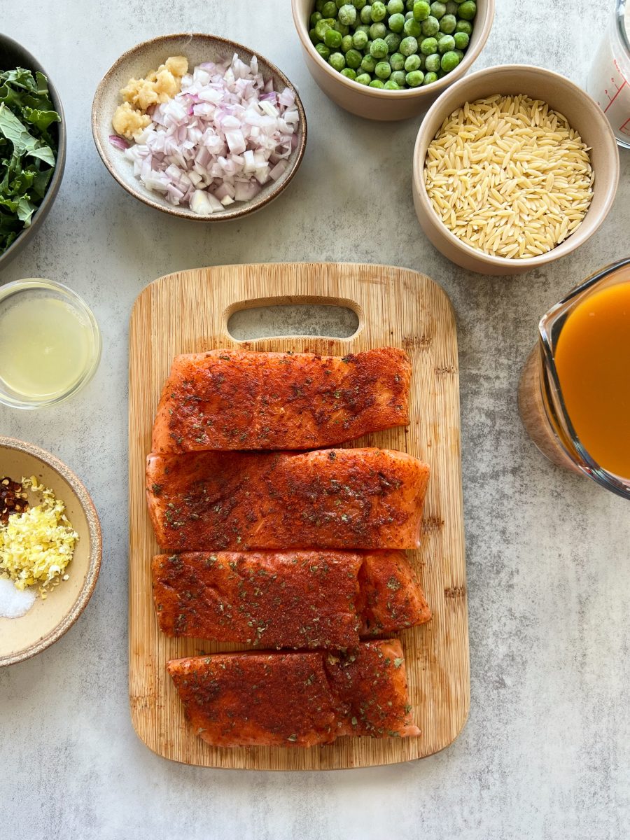 1-Like many recipes, this dish is best when served right away. If you are preparing this ahead of time and reheating at dinner, I suggest following steps 1-5, but removing the pan from the flame once you add all of the liquids. 20 minutes before dinner time, you can simmer the pan to cook the orzo for 10-12 minutes, then add the salmon back into the pan to continue cooking.