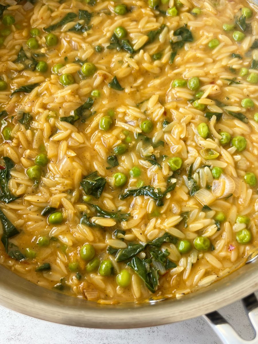 - After a couple of minutes, add in the broth, coconut milk, kale and peas and let the orzo cook for 10-12 minutes
