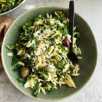 A simple orzo kale salad with lemon vinaigrette topped with parmesan, pumpkin seeds, and marinated olives. It’s the perfect weeknight meal!