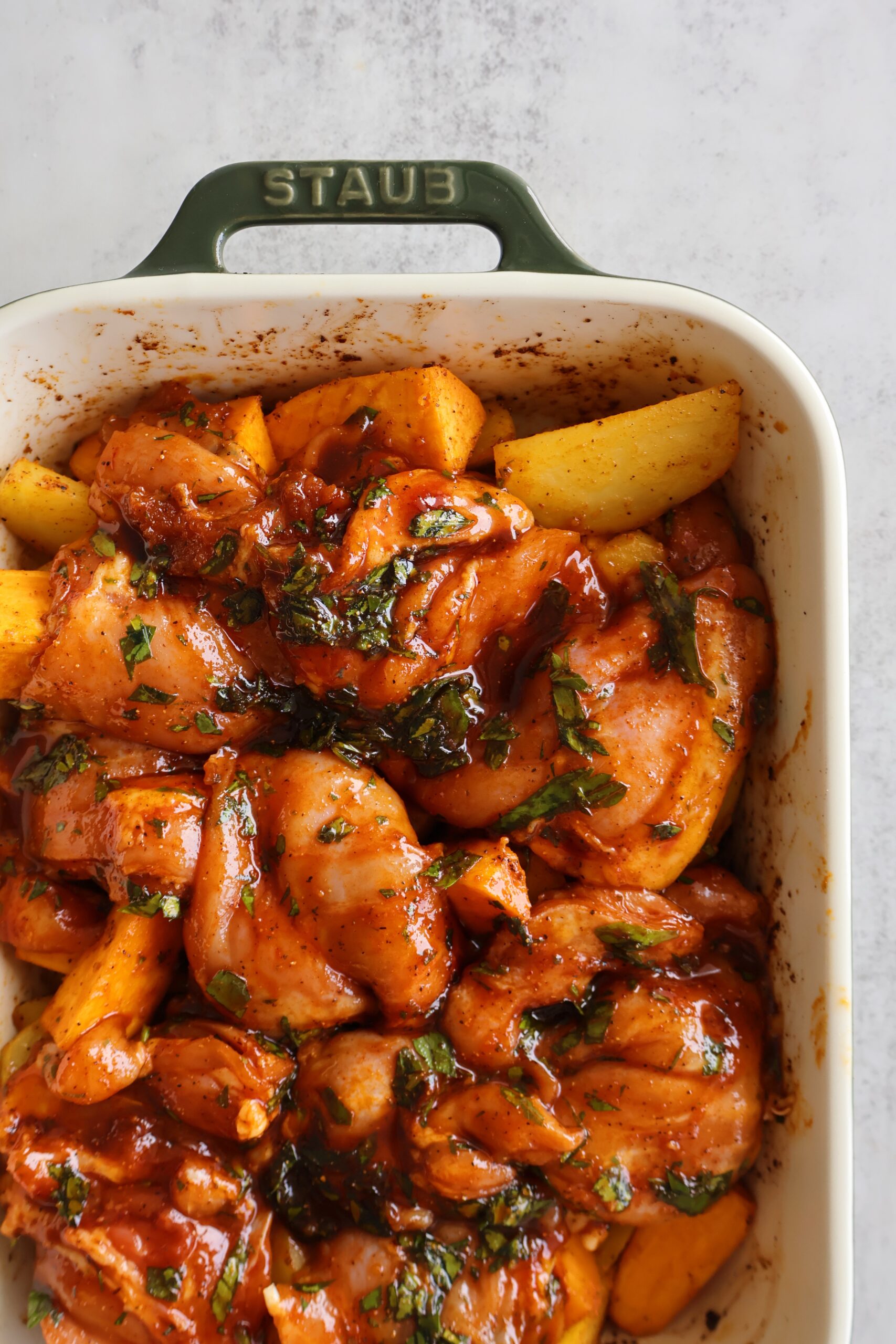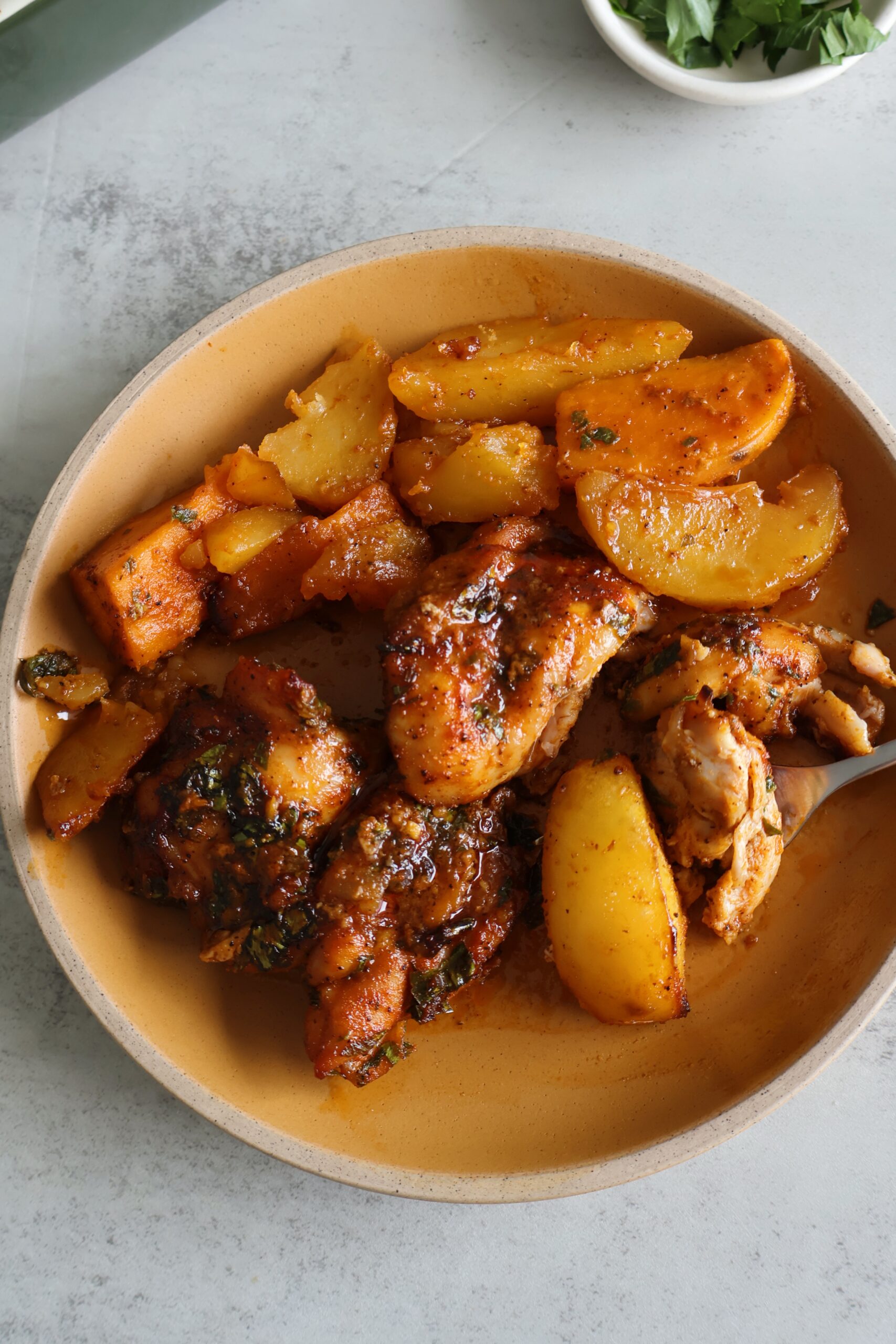 - While the potatoes bake, marinate the chicken thighs in a bowl with the olive oil, spices, date syrup and parsley. Let the chicken marinate until the potatoes are out of the oven.