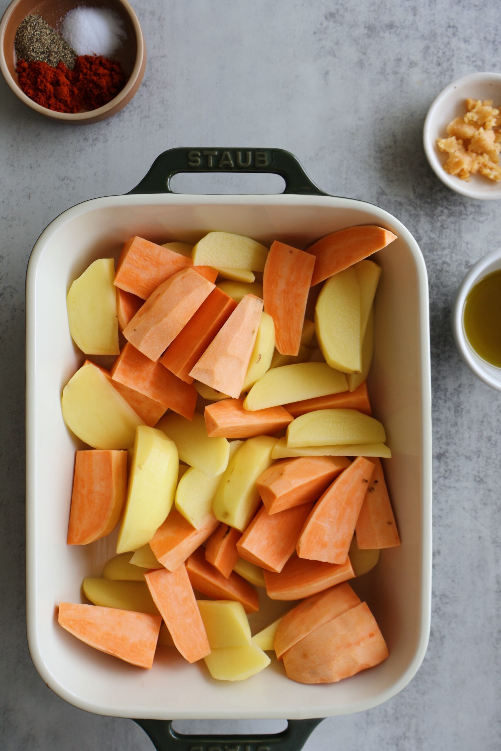 - Add them to a baking dish and toss them with the olive oil and spices.