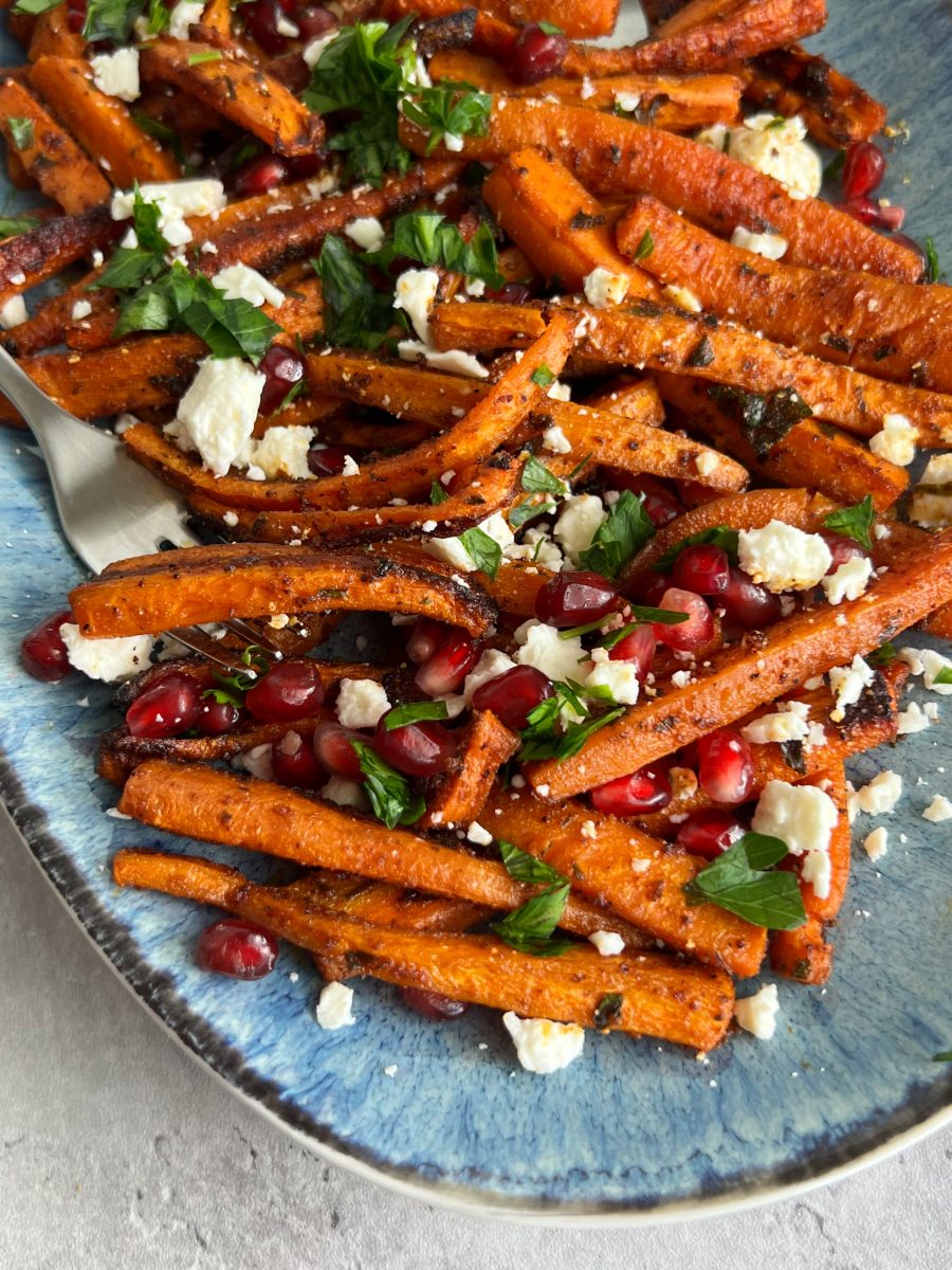 The carrots are peeled and chopped then tossed in a simple spice mixture. They’re roasted until crispy and topped with feta cheese, pomegranate seeds and fresh herbs.
