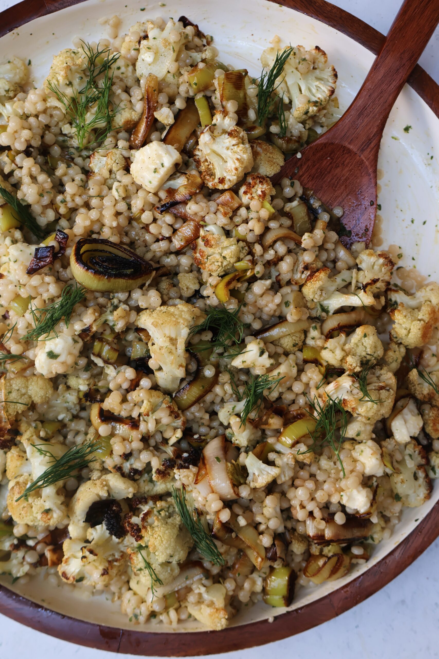 - Assemble the salad by adding the pearl couscous, roasted cauliflower, sauteed leeks and feta cheese to a bowl or platter. Top with the dressing and toss together.