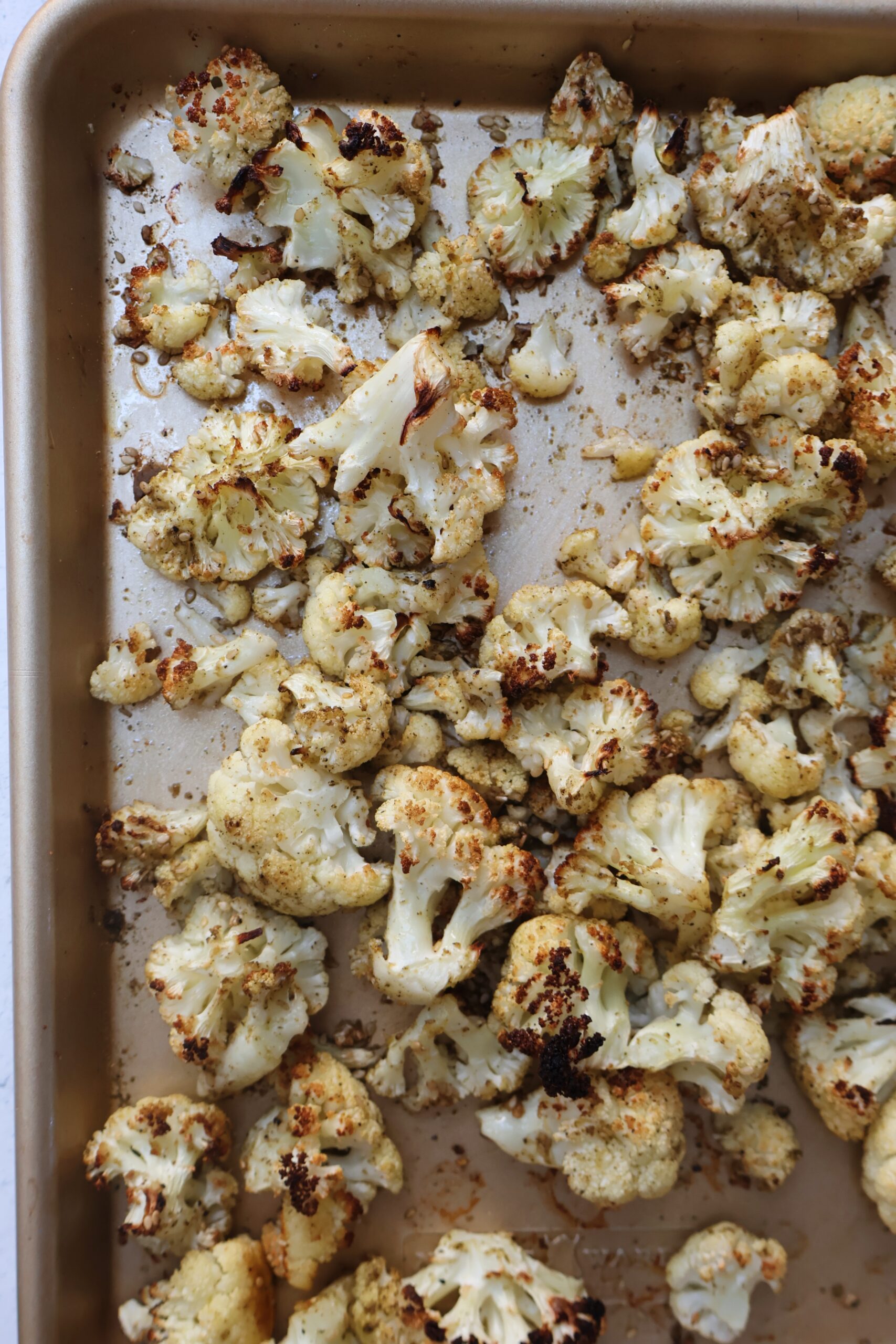 - Cut the cauliflower into small florets. Add them to a large baking sheet and toss with 1/4 cup olive oil, 2 tsp za’atar seasoning and salt & pepper.