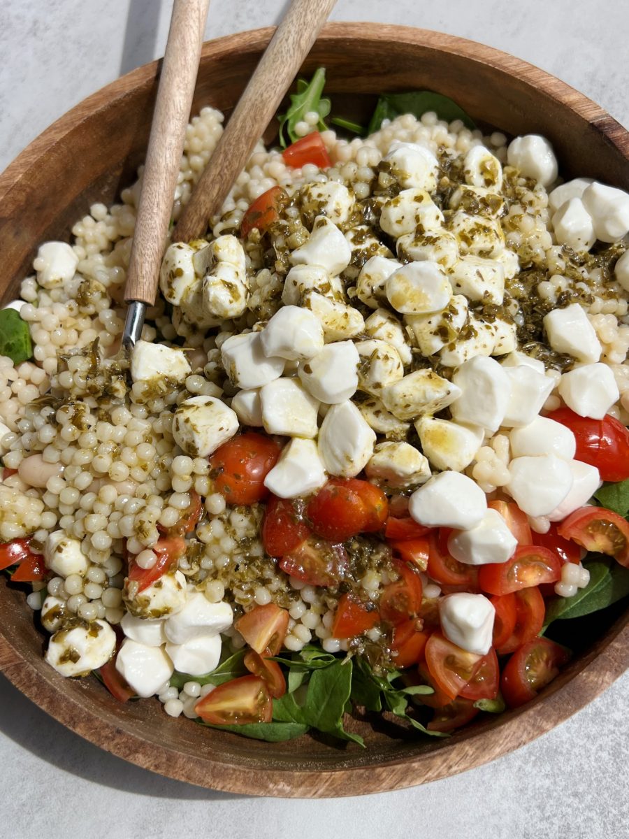 Pearled couscous, tomatoes, mixed greens and mozzarella pearls get tossed together in a simple pesto dressing to make this pearl couscous salad. It comes together in just 30 minutes, and is such a simple weeknight meal to add to your weekly prep!