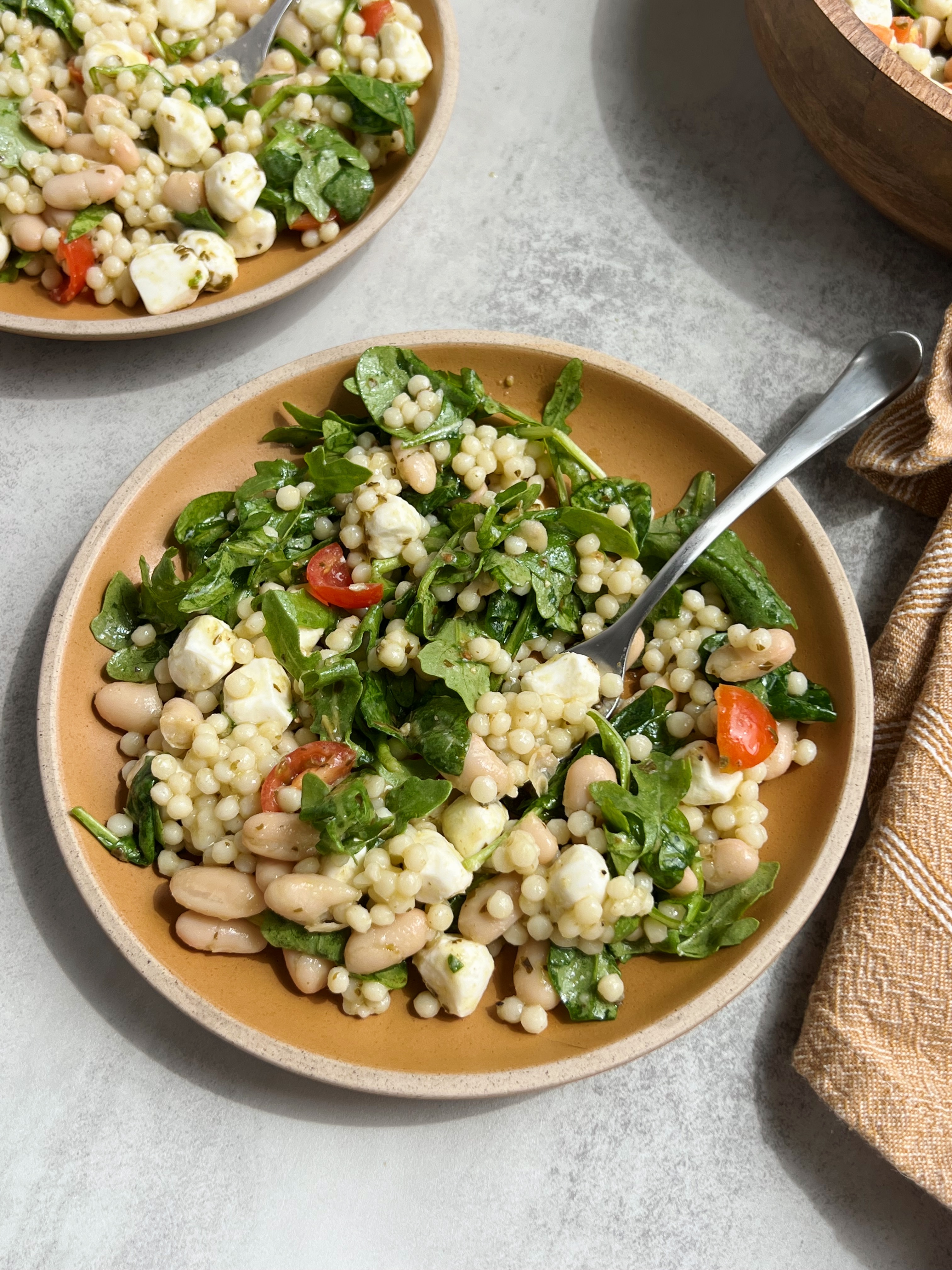 - Add the greens, cannellini beans, tomatoes and mozzarella to a salad bowl with the pearl couscous and toss together with the dressing.
