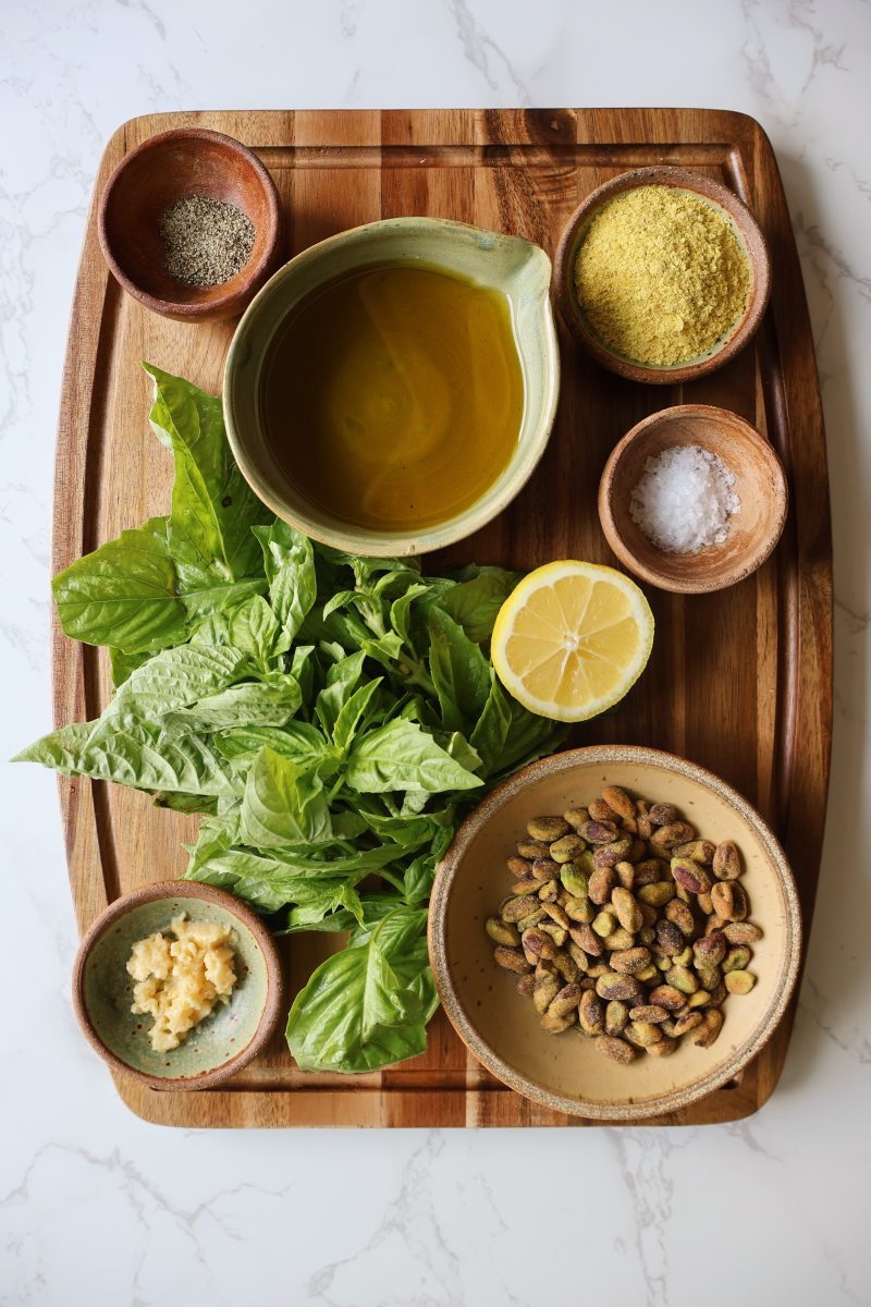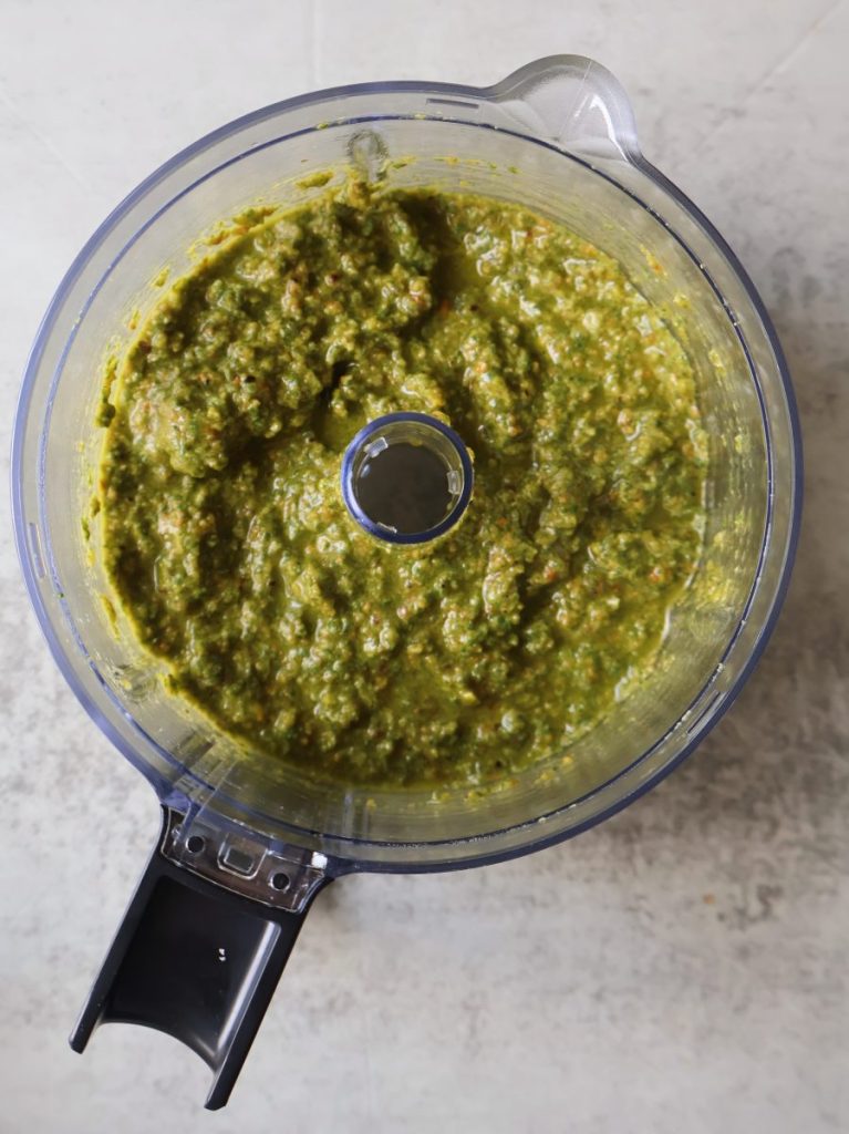- Prepare the pistachio pesto by adding all of the pesto ingredients to a food processor or blender and blending until smooth. Add more olive oil, if needed, for a smoother pesto.