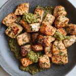 Cubed salmon bites are seasoned with lemon juice, fresh parsley and Italian seasoning then baked or air-fried until crisp. They’re served over a dairy-free pistachio pesto that complements the fish so well.