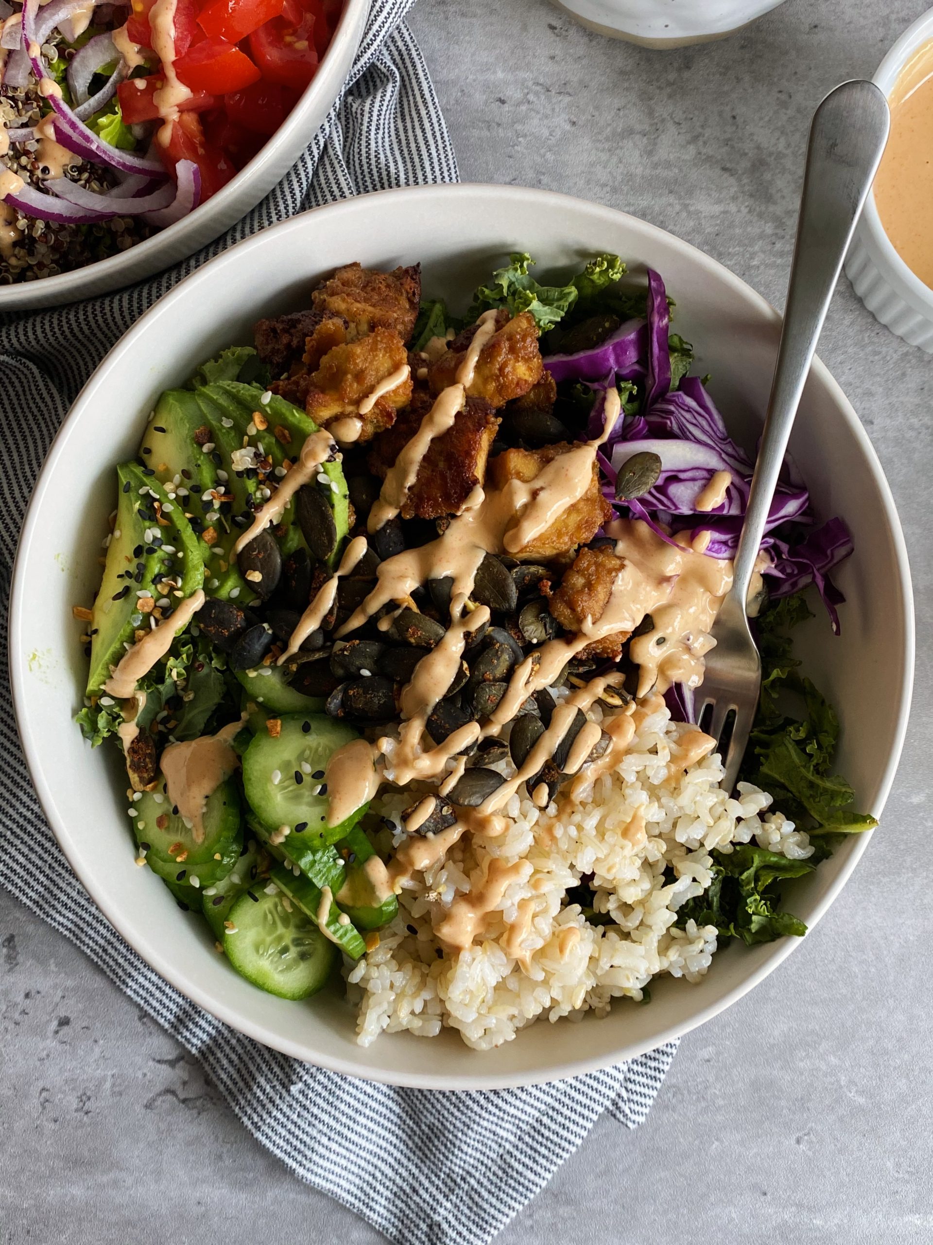 To keep these plant-based, I love adding tofu or any kind of bean. The protein adds that satiating factor to the bowls, and helps complete the meal. Some other options would be tempeh, chicken, or any variety of beans!