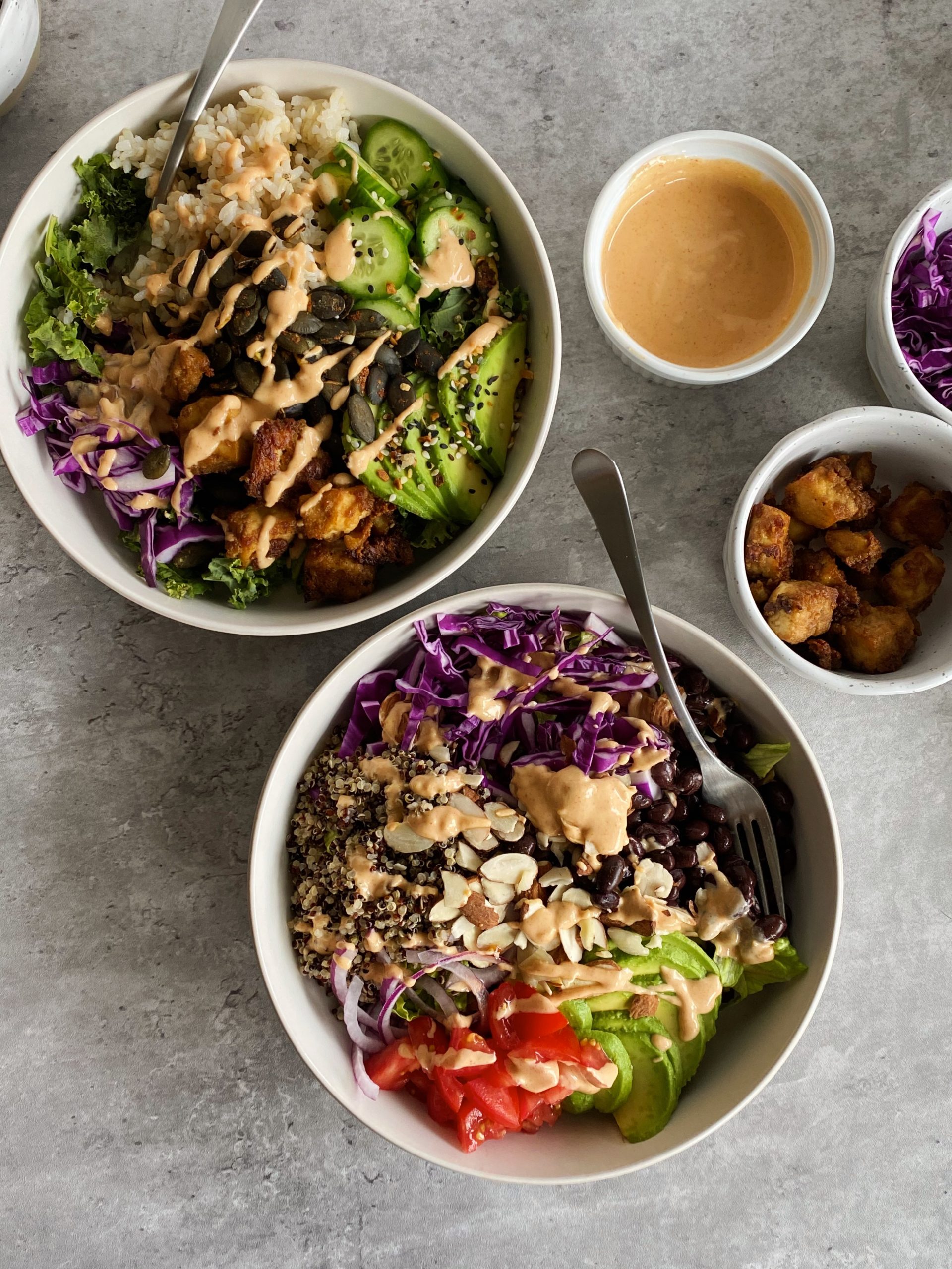 The combinations are endless to what you can add in to your bowls, but these two combinations of crispy tofu with brown rice, and black beans & quinoa are two of my favorite ones that are both satisfying and delicious!