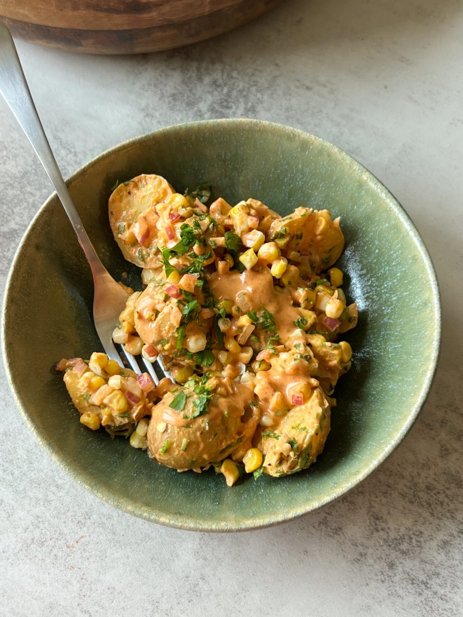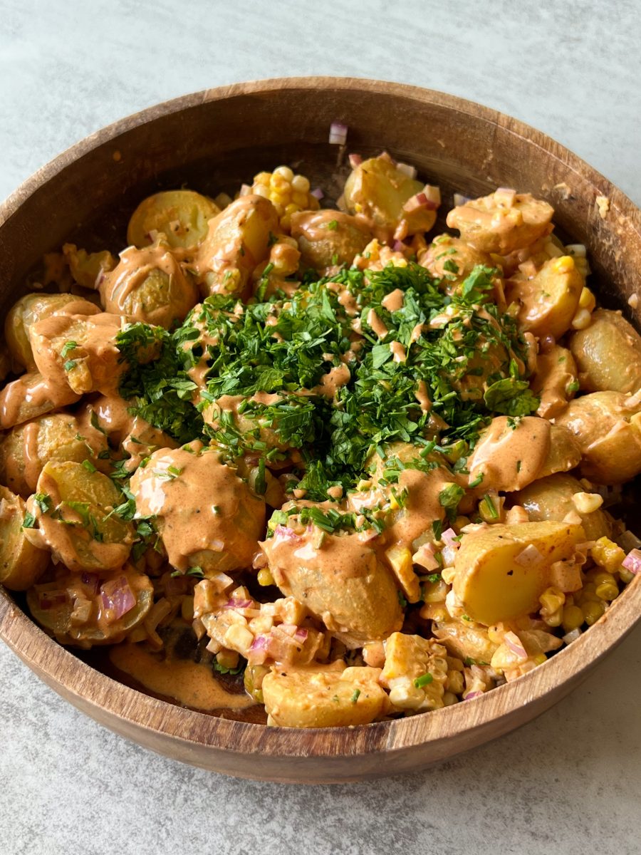This smokey potato salad with corn & fresh herbs is so easy to make and packed with flavor. It’s a lightened up version of the classic potato salad, with some added spice for extra flavor.