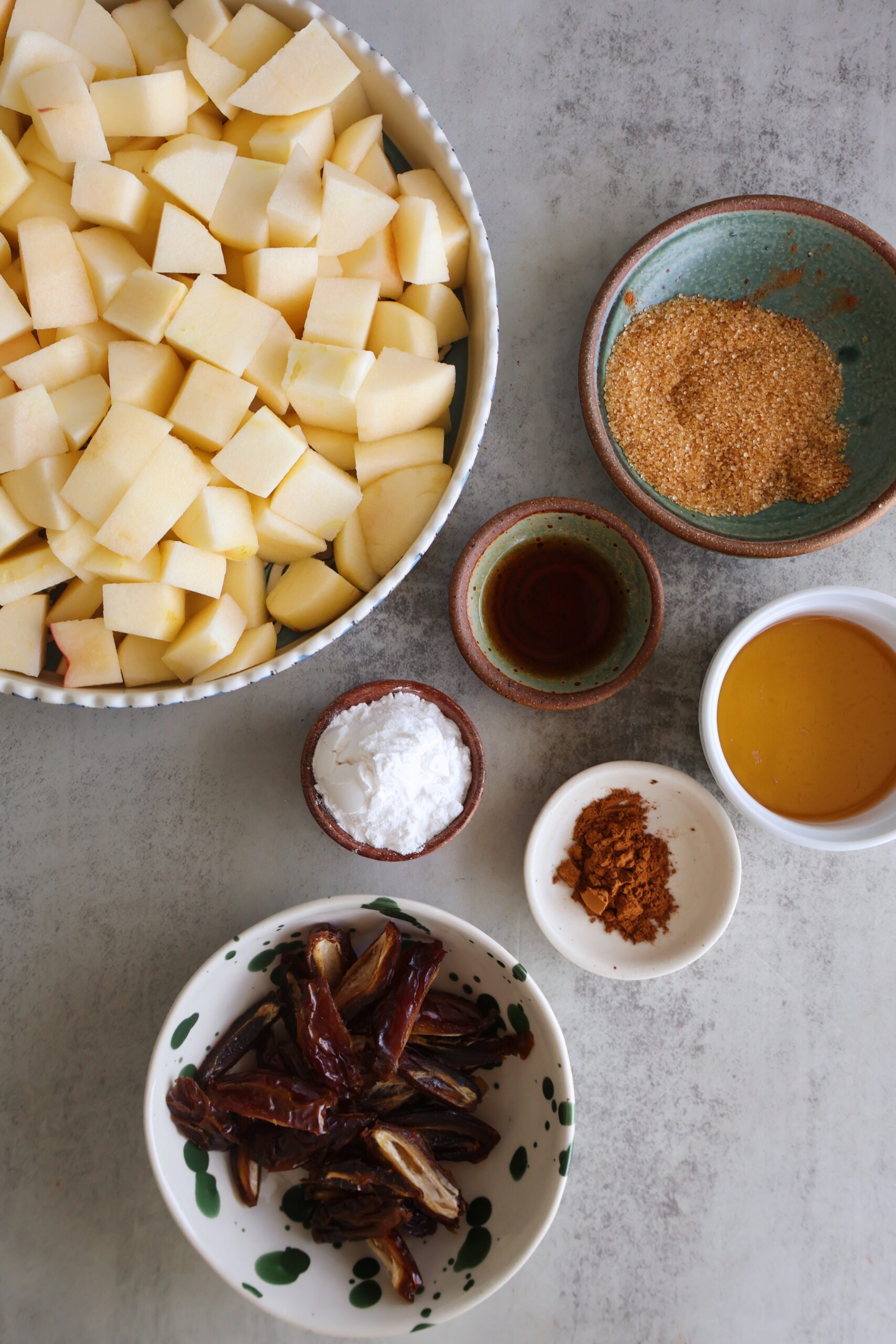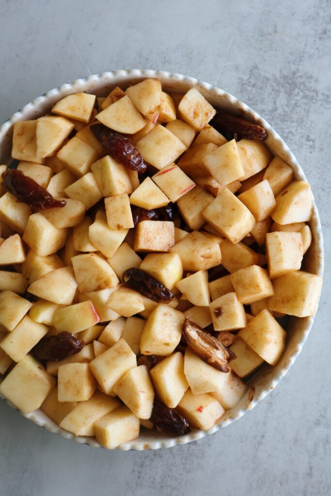 - Add the apples and dates to a 10-12″ pie dish with the tapioca flour, cinnamon, pinch of salt and honey. Toss together until well combined.