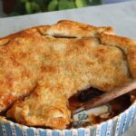 - Roll out the puff pastry to thin it out so its large enough to fit over the filling. Cover the filling with the rolled out pastry sheet, pressing the edges into the pan, and folding over any overlapping pieces.