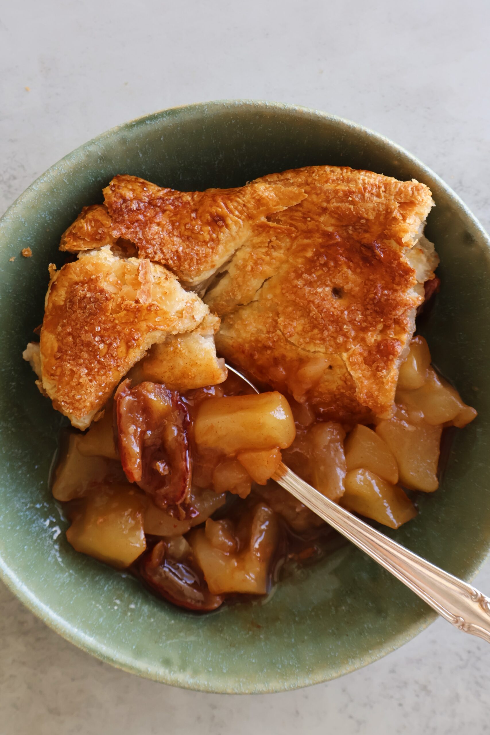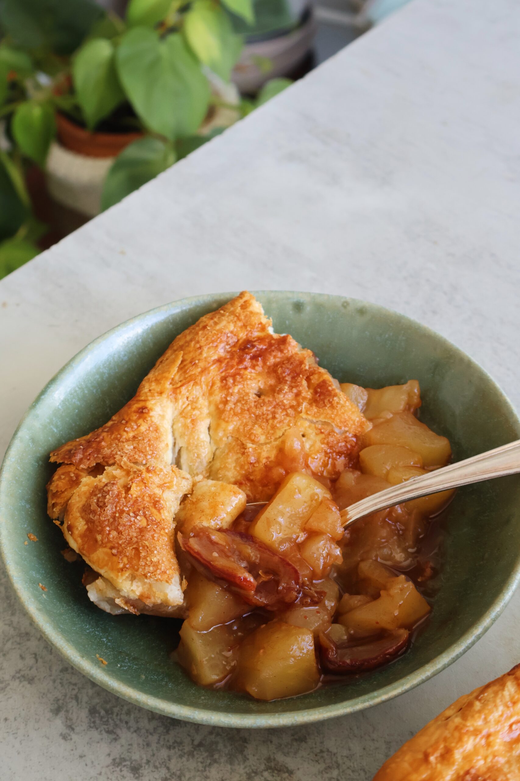Soft, cinnamon flavored apples paired with the natural caramel sweetness of dates and crisp & flakey puff pastry come together to create a dessert that feels indulgent, yet effortless.