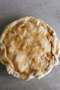 - Brush the top with the whisked egg, then poke some holes throughout the top with a fork.