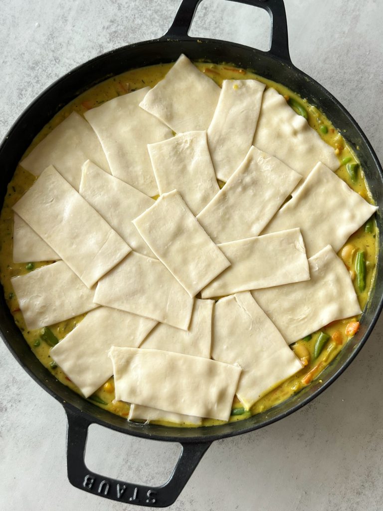 - Cut your pastry sheet into 20 smaller rectangles. Once the filling has thickened, take the pan off the fire. Layer the pastry sheets over the top of the filling, overlapping the ends to cover the dish