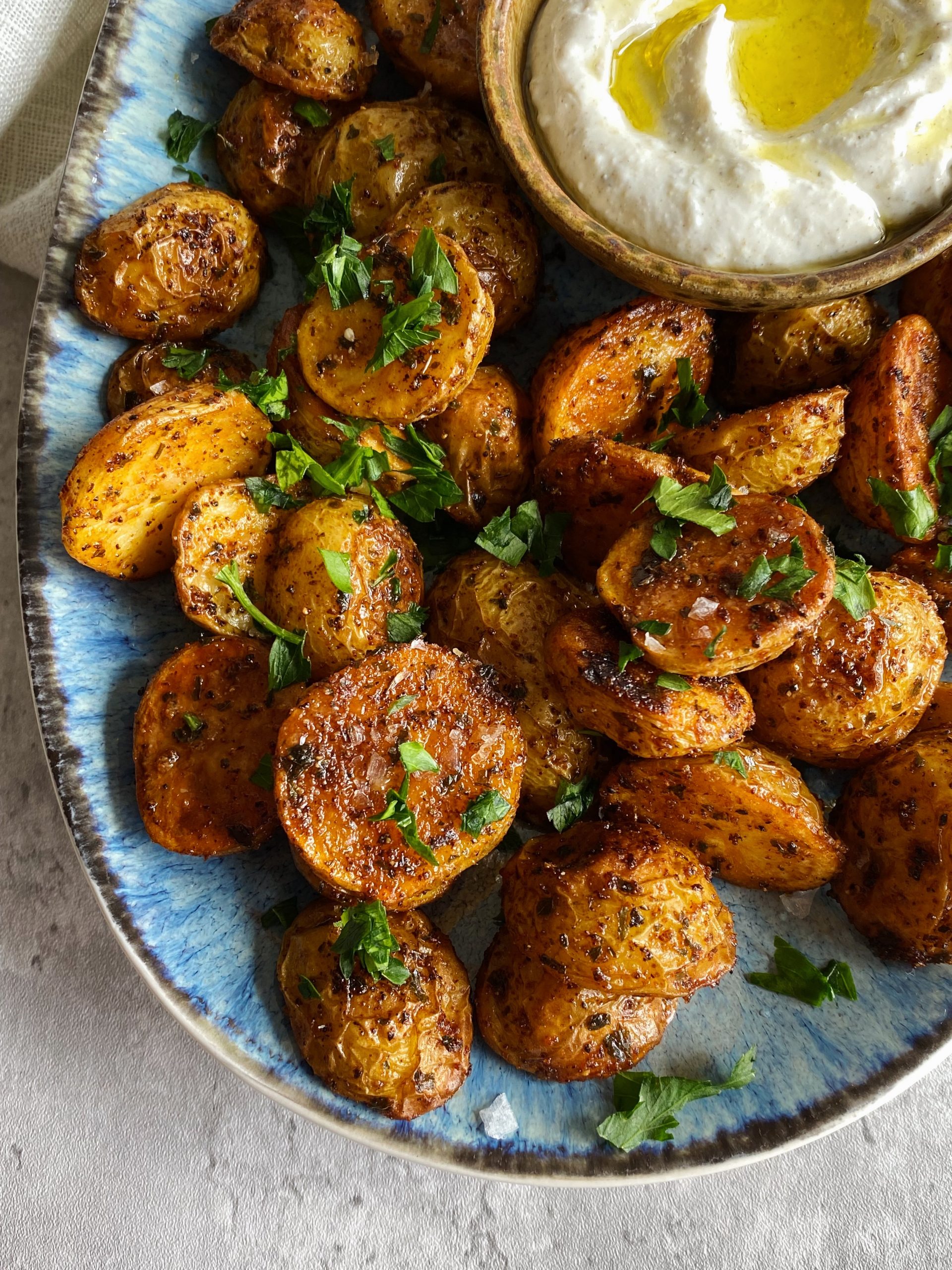 Roasted baby potatoes are the perfect side dish to any meal! Serve them with your favorite main course alongside the simple creamy za’atar yogurt dip.