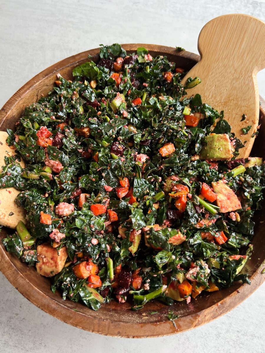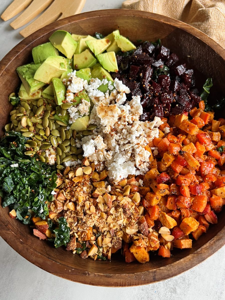 This beautiful, color-packed kale salad is the perfect nourishing meal. Its filled with feel-good ingredients like tuscan kale, roasted beets and carrots, avocado, and nuts & seeds.