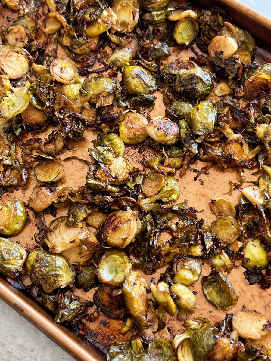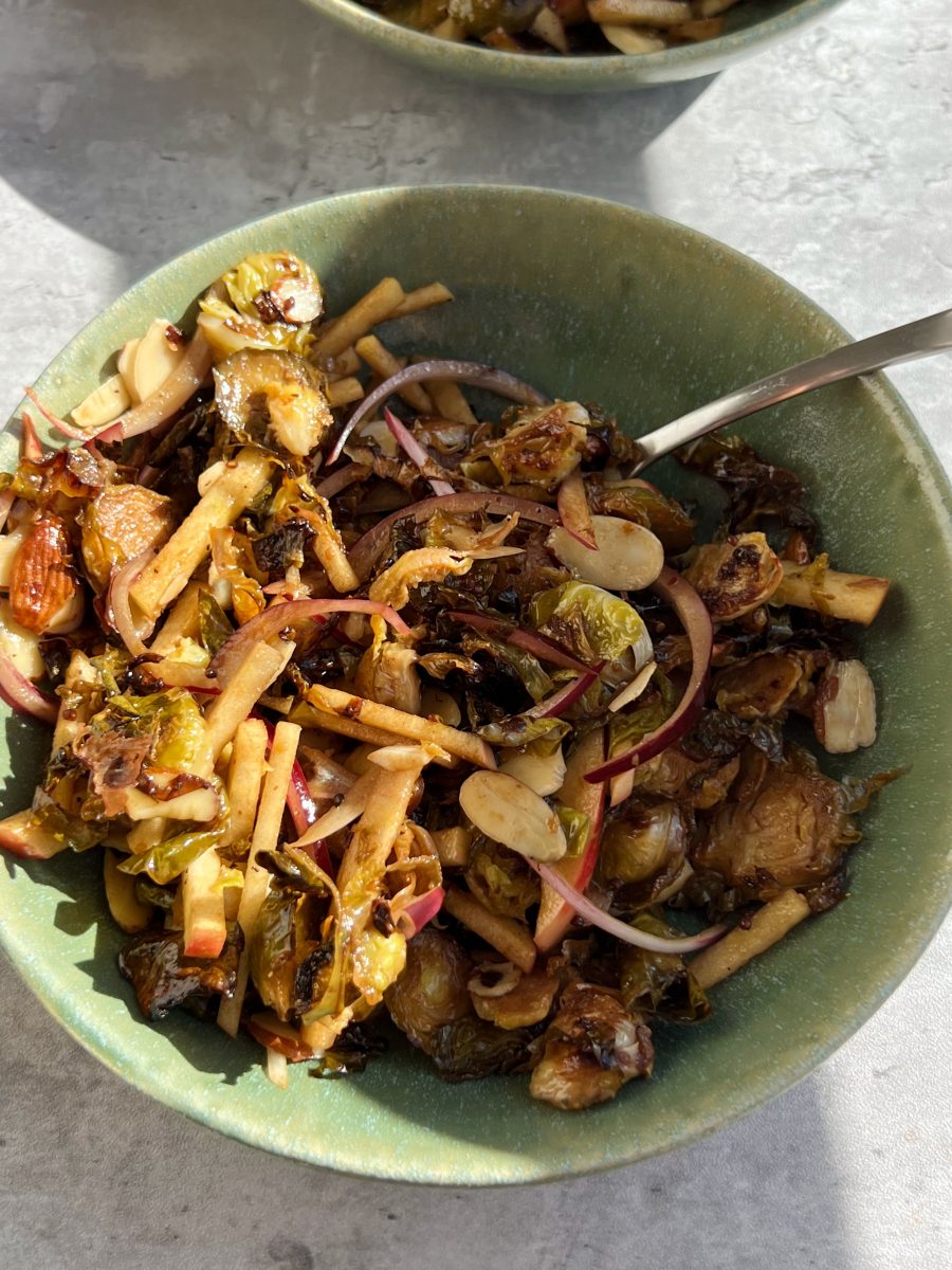 The brussels sprouts get roasted in balsamic vinegar, dijon mustard, maple syrup and a few other simple seasonings. Once they’re ready, they get mixed in with thinly sliced red onion, apples and crunchy shaved almonds.