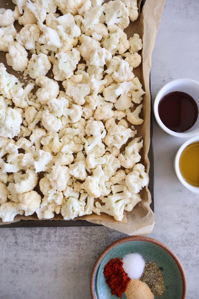 - Trim the stem off the cauliflower and cut into small florets. Toss with olive oil, date syrup and a simple spice blend of paprika, garlic, salt & pepper