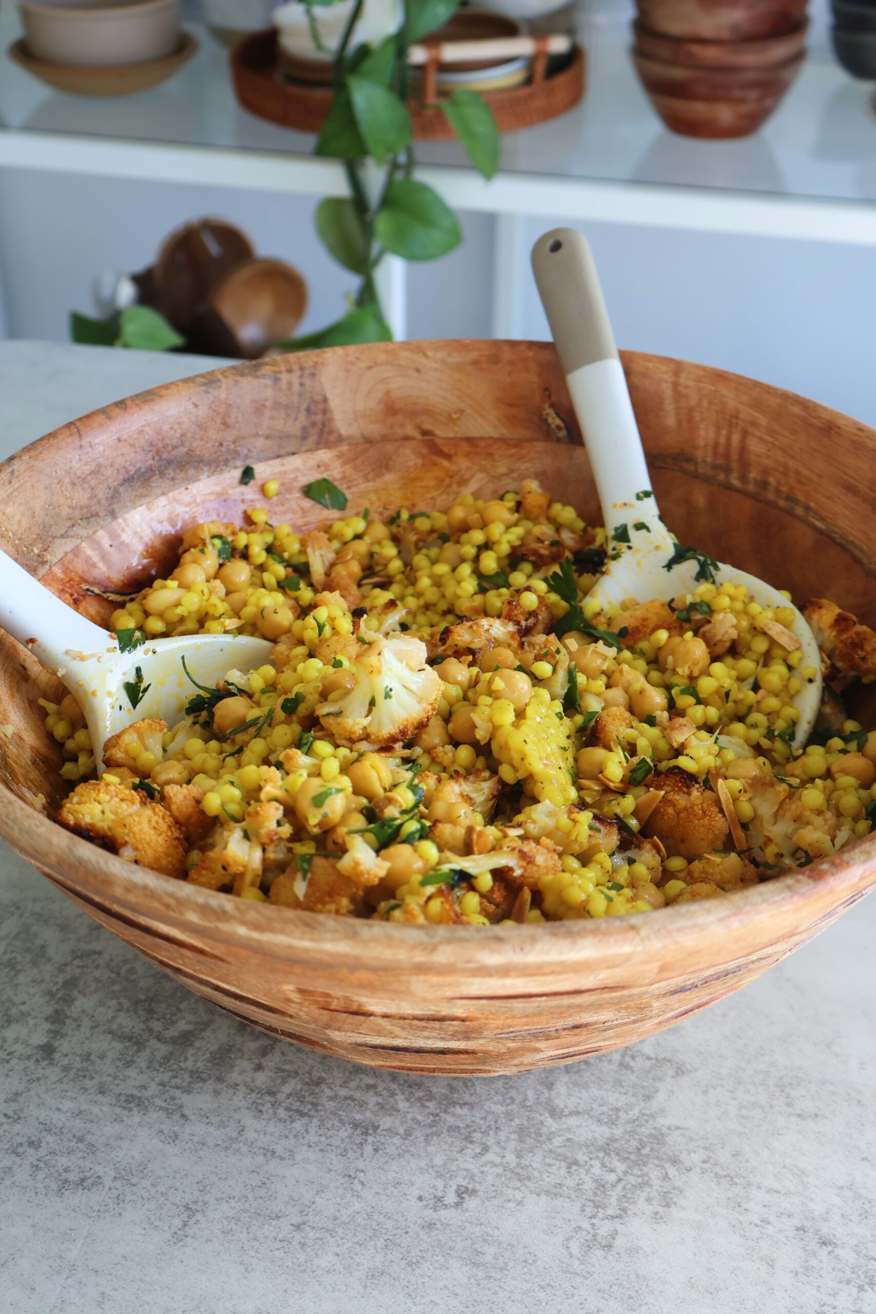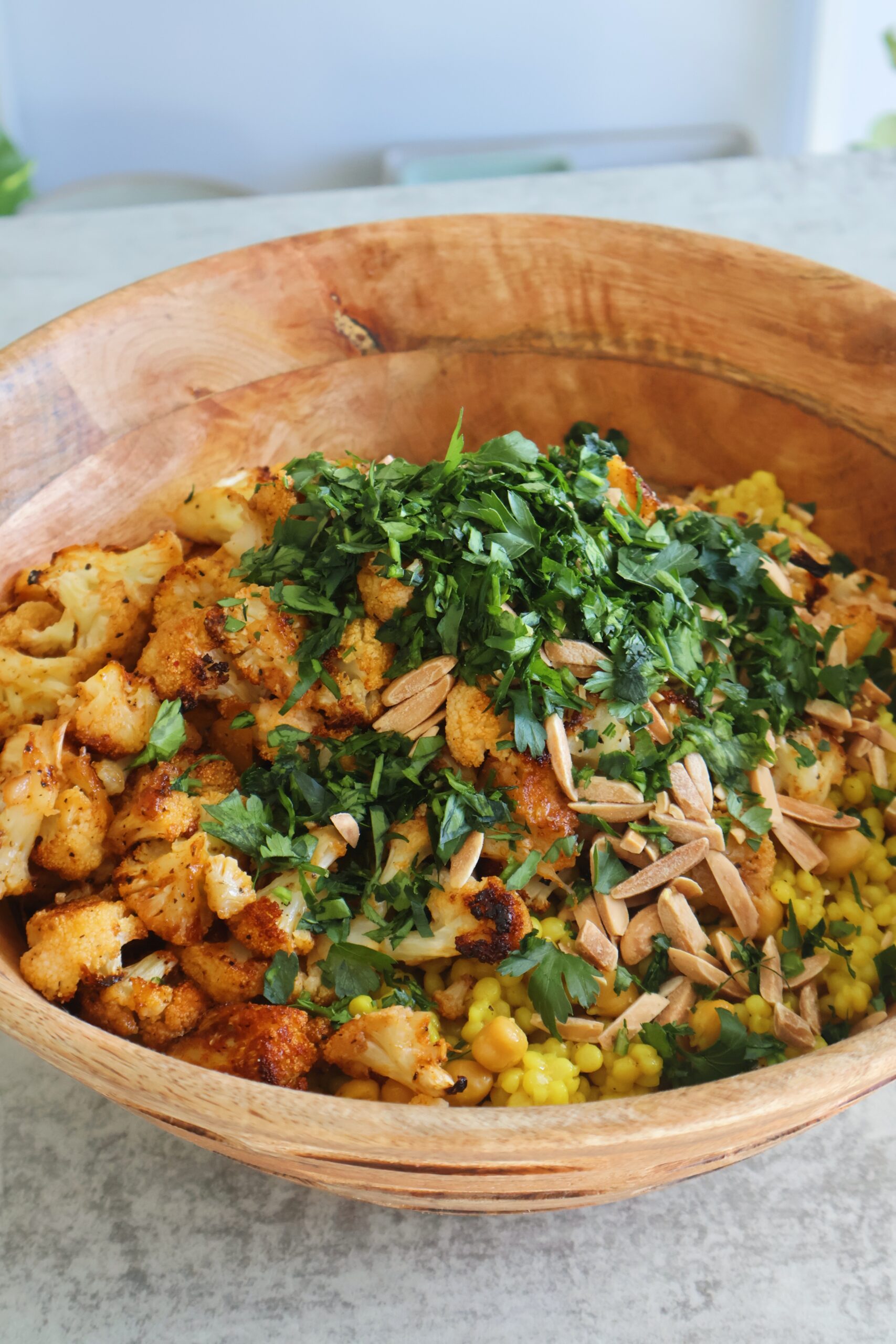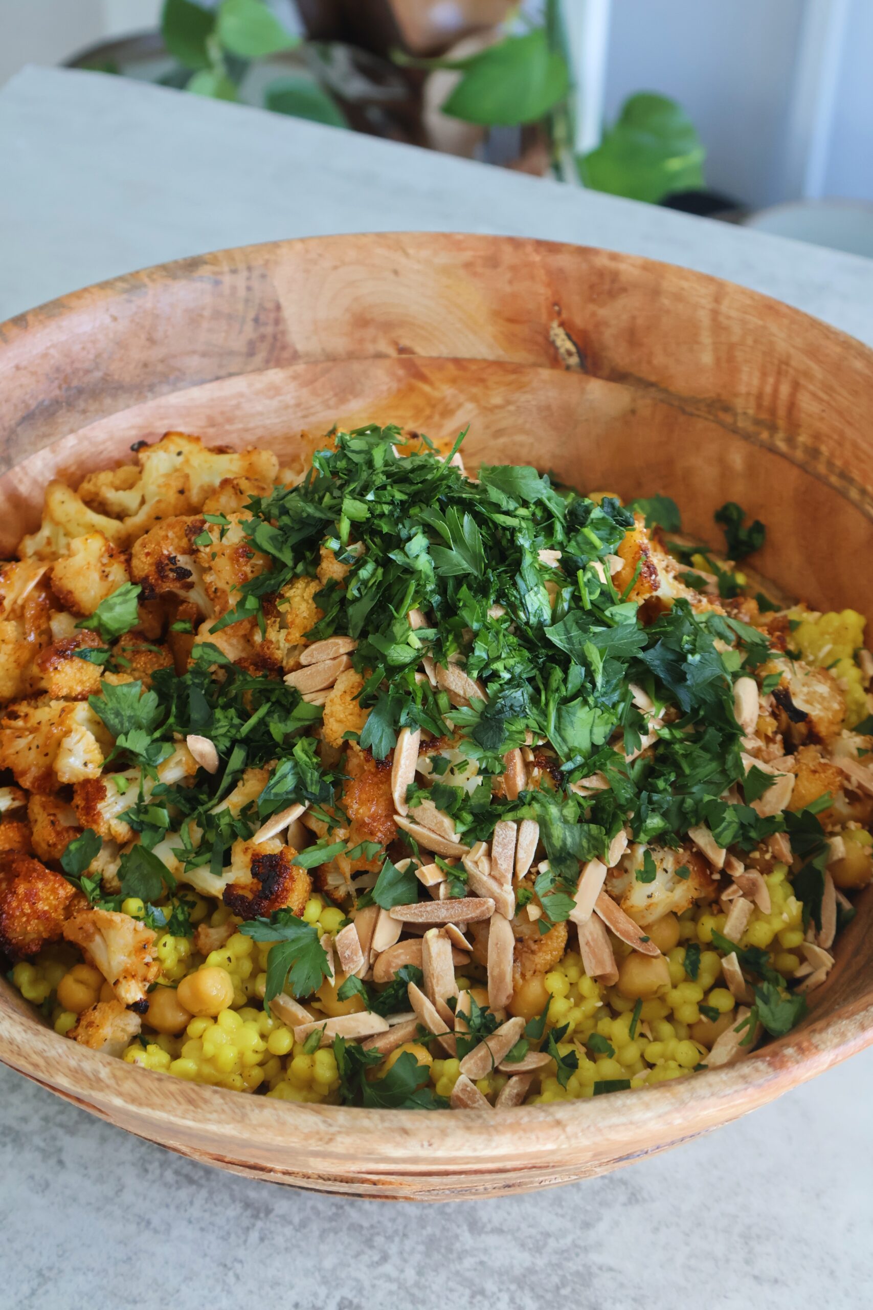 - Once the cauliflower is ready, transfer to a bowl with the chickpea couscous mix and toss with the slivered almonds and parsley. Add a pinch of salt as needed and golden raisins if using.