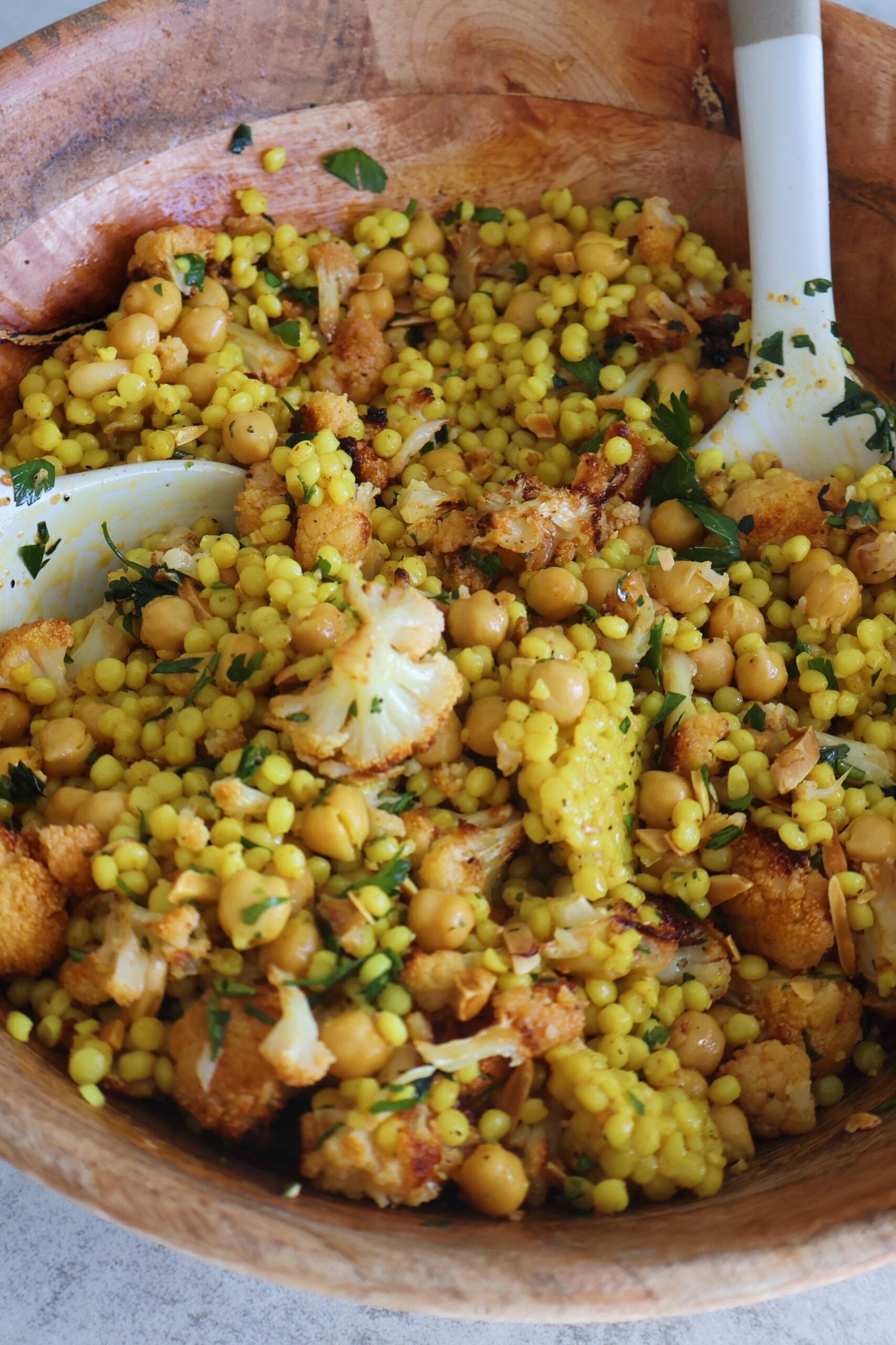 - Toss with the chickpeas, roasted cauliflower, chopped parsley and almonds
