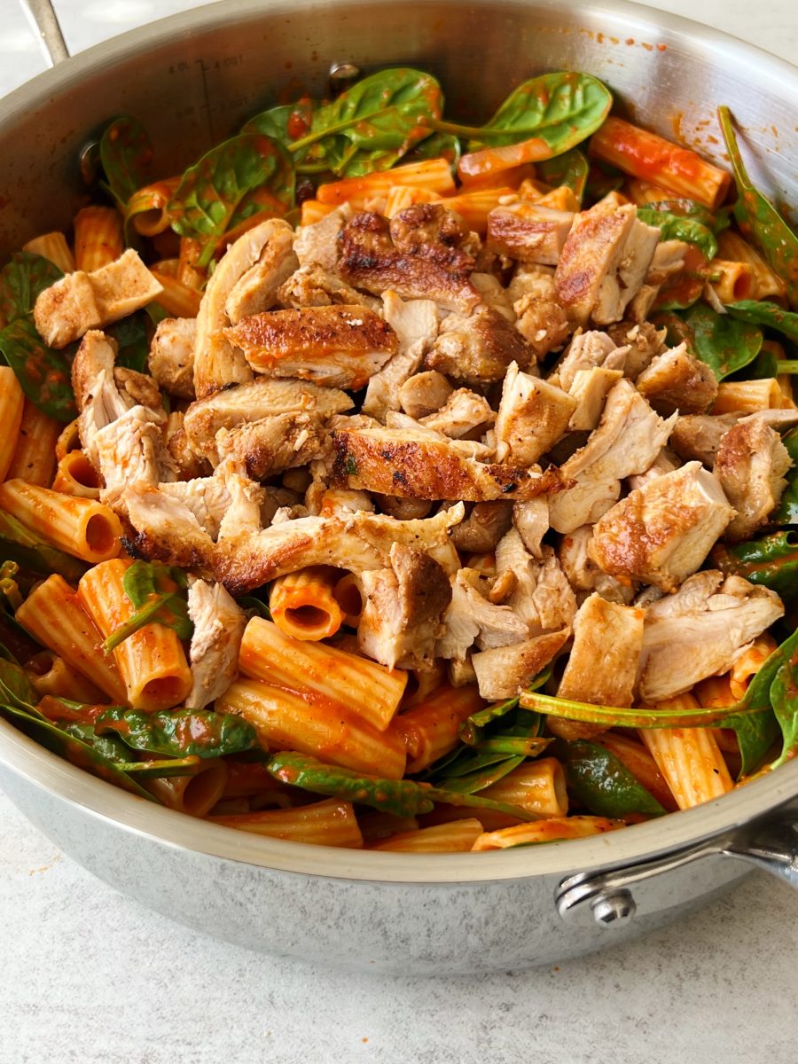 - Once the sauce is seasoned to your liking, mix in the pasta and spinach and toss together. Dice the cooked chicken and mix it into your pasta