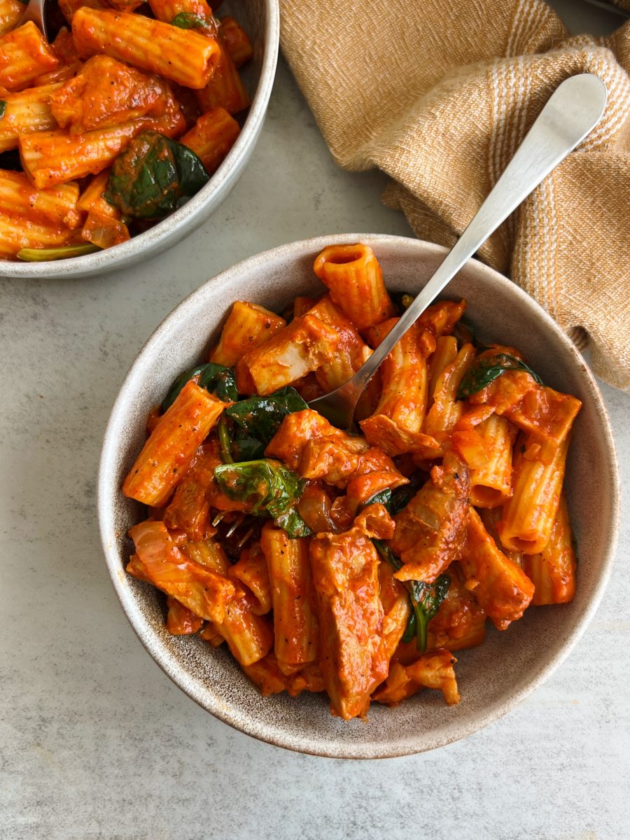 Roasted Red Pepper Pasta with Chicken! It’s the ultimate comfort food that’s both hearty and healthy, perfect for those busy weeknights when you need a satisfying meal in a pinch.