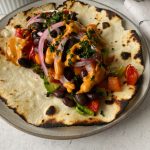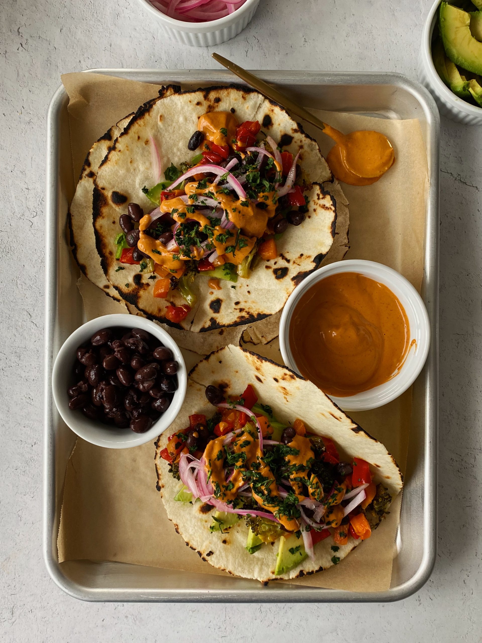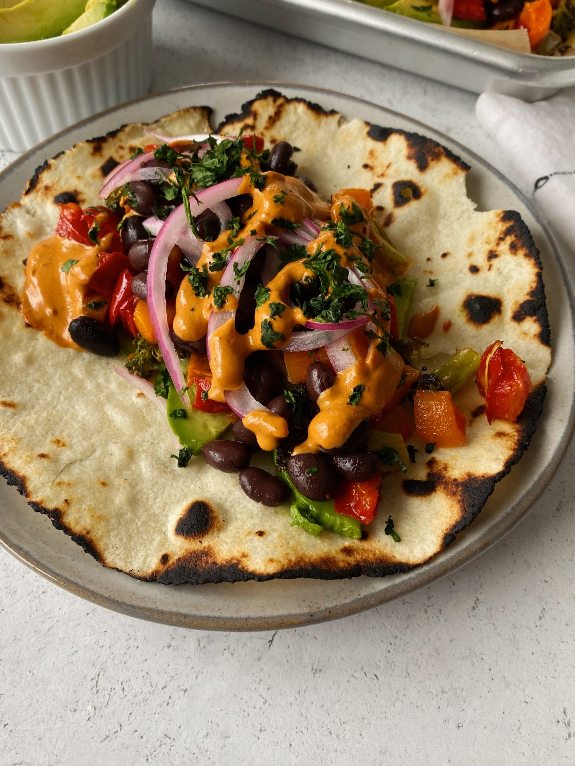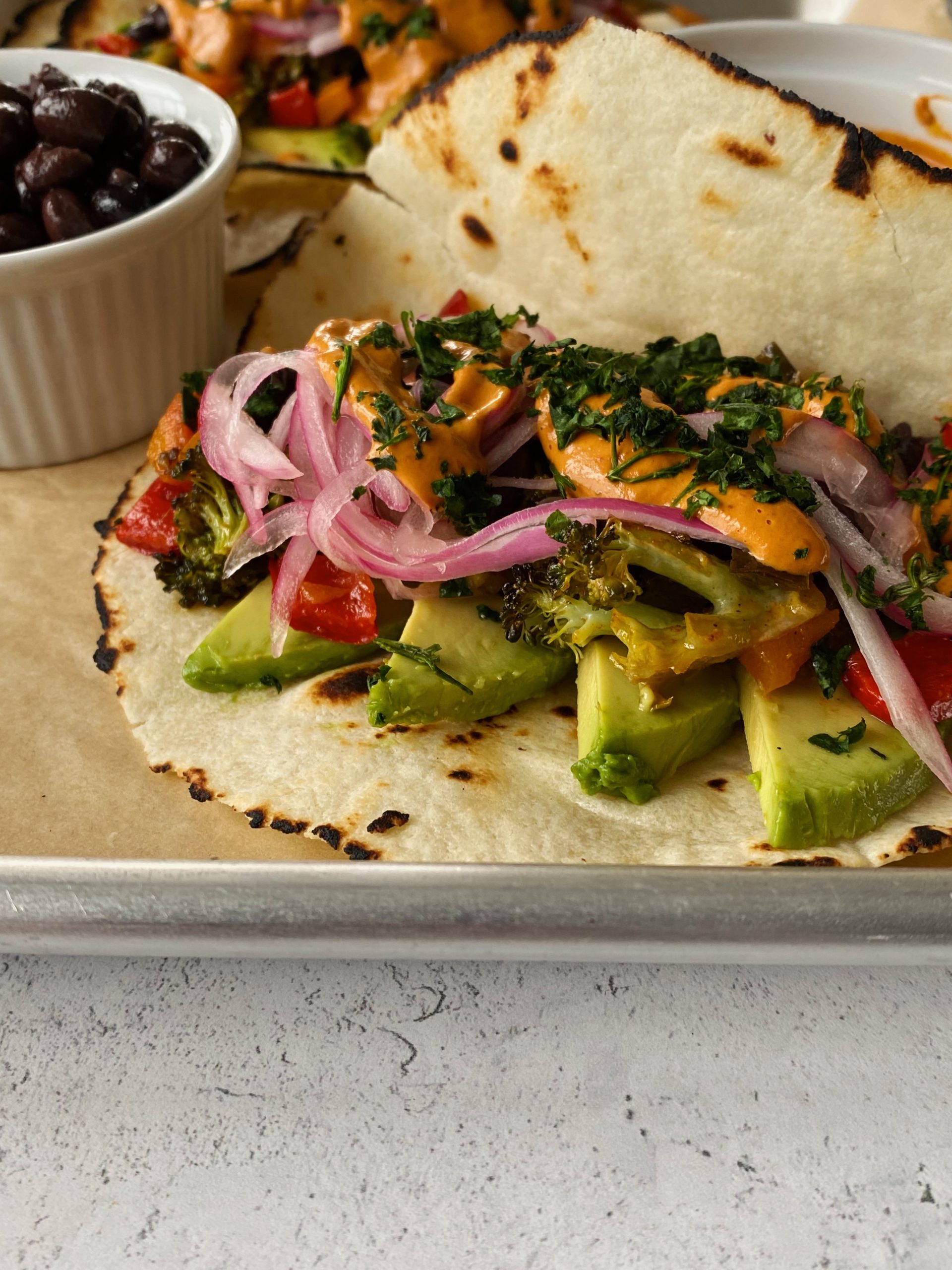 - When ready to serve, layer them with sliced avocado, black beans, roasted veggies, chipotle mayo, and pickled onions if using