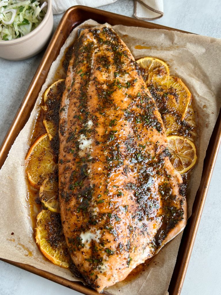 - Slow Roasted Salmon with Fennel Slaw– slow-roasted sumac salmon topped with a fresh fennel slaw