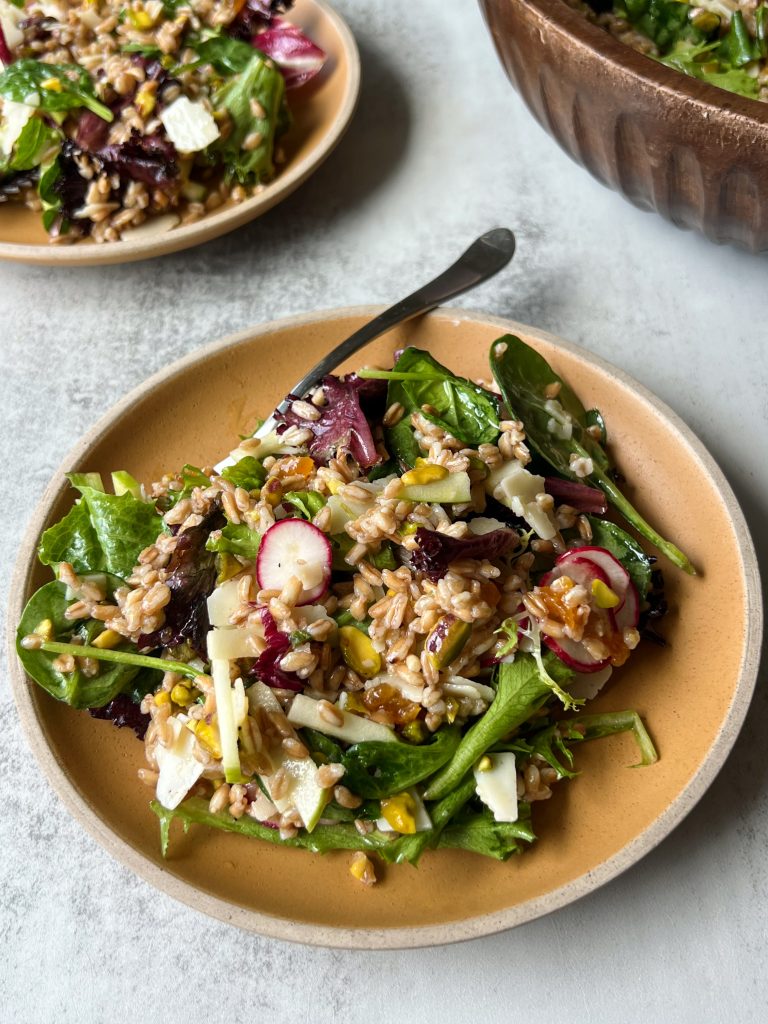 - Farro Salad with Apricot Vinaigrette– farro salad with shaved parmesan (optional), roasted pistachios and green apples tossed in a sweet apricot vinaigrette