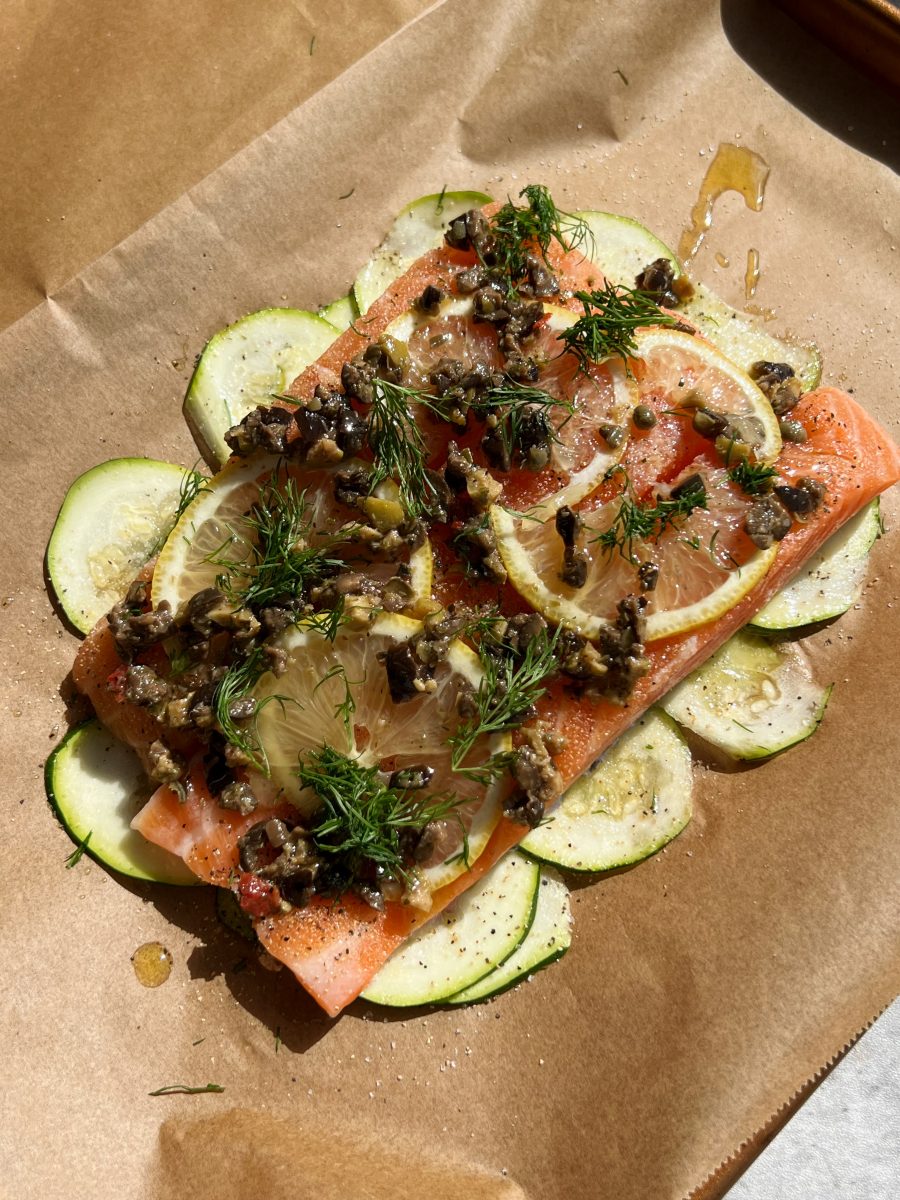 Salmon in parchment is a simple and delicious dinner. Thinly sliced zucchini topped with salmon fillets, olive tapenade and fresh dill. The perfect combination of flavors that comes together in 30 minutes!