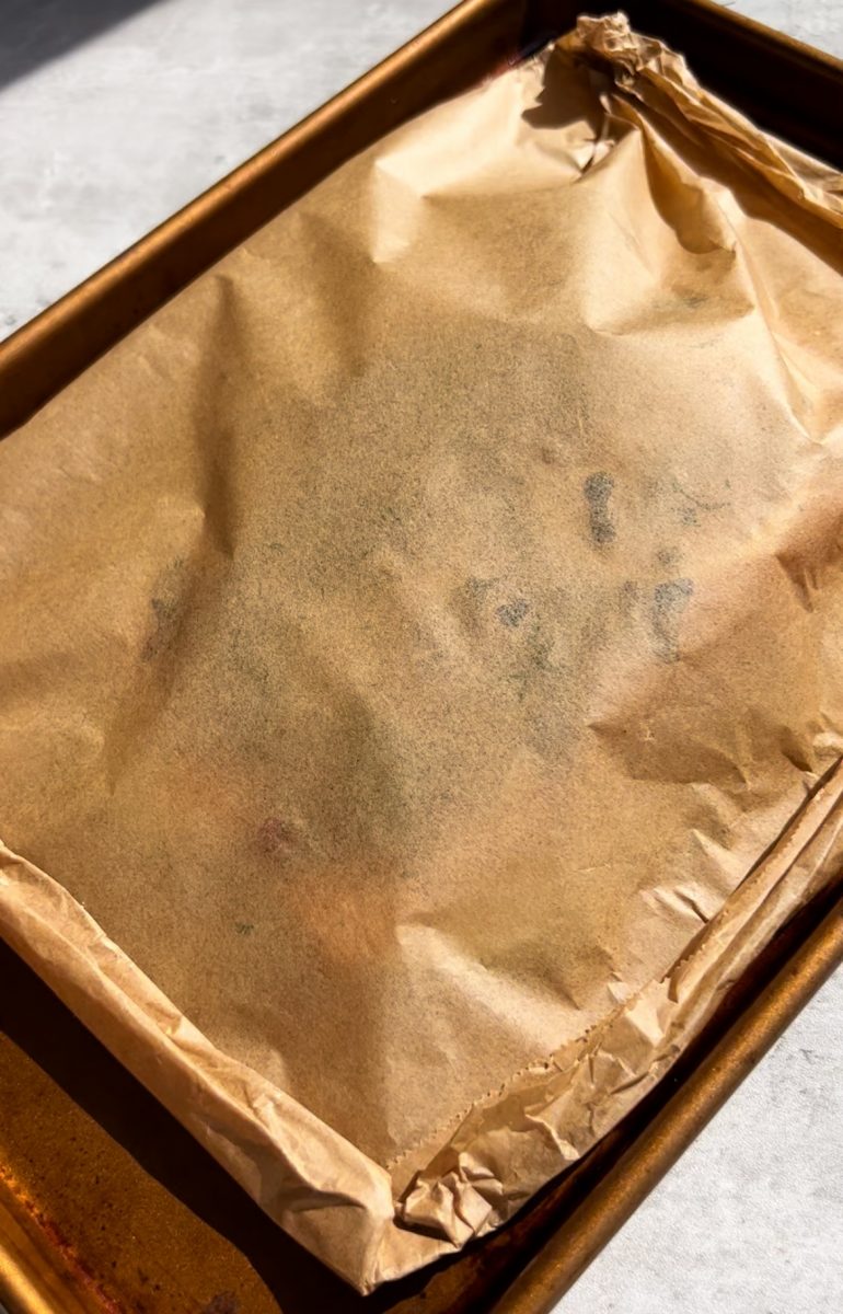 - Cut a large piece of parchment paper and fold it in half. Open it up and place one half on a baking.