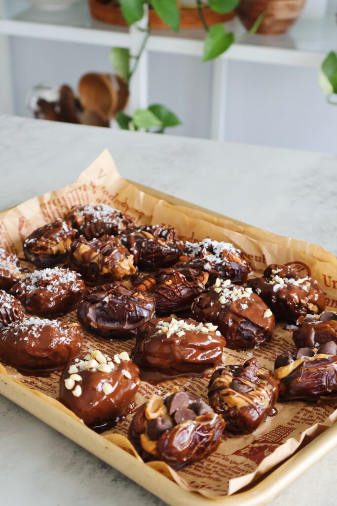 - Line a small baking dish or sheet-pan with parchment paper- I used a small 9 x 6 pan. Remove the pits from the medjool dates and flatten them gently with your fingers. Press them into the bottom of the dish in rows of 3 as the base layer