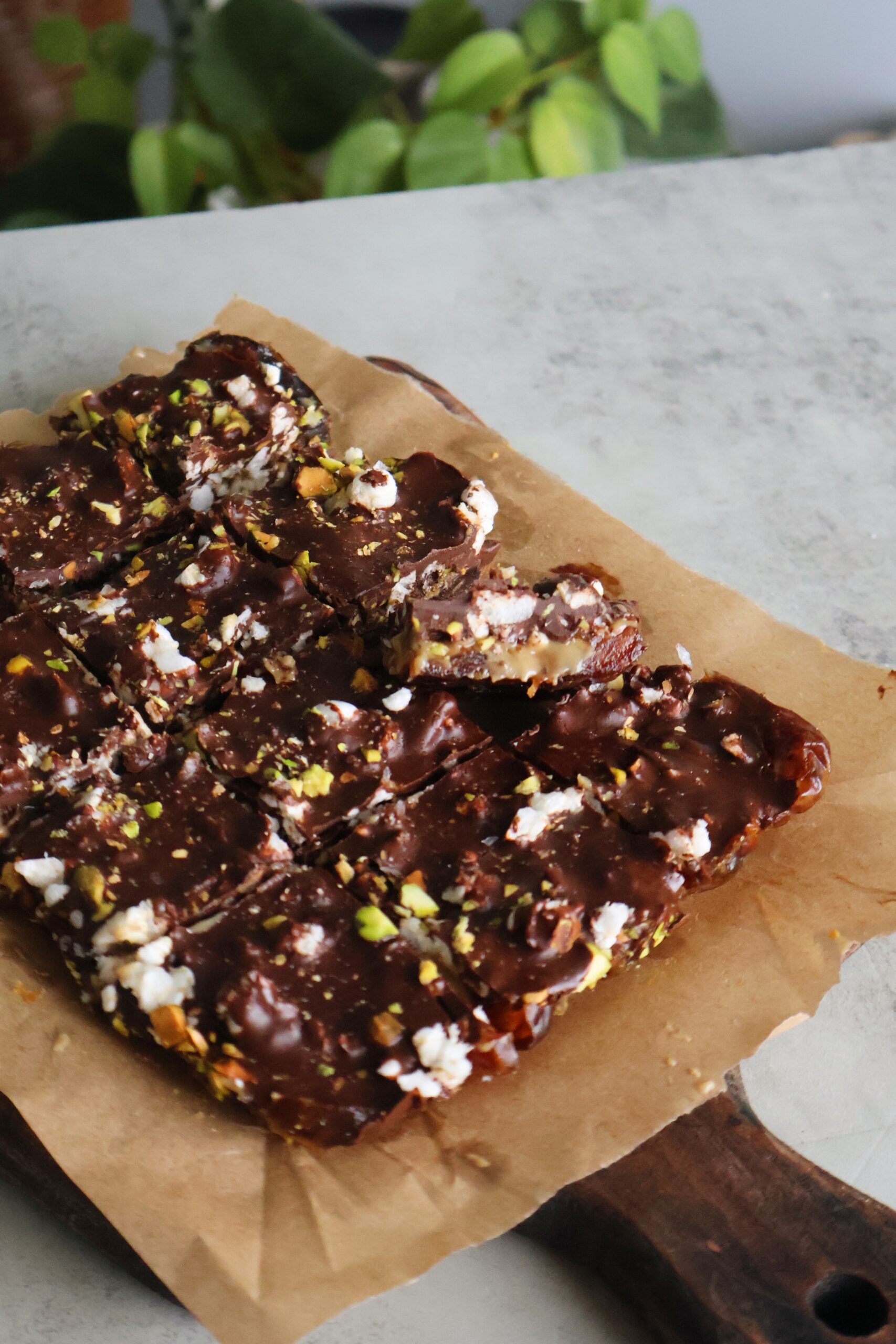 - Melt the chocolate chips with the coconut oil in 30 second increments until smooth. Pour the chocolate over the bars, then top with more chopped pistachios and flakey salt
