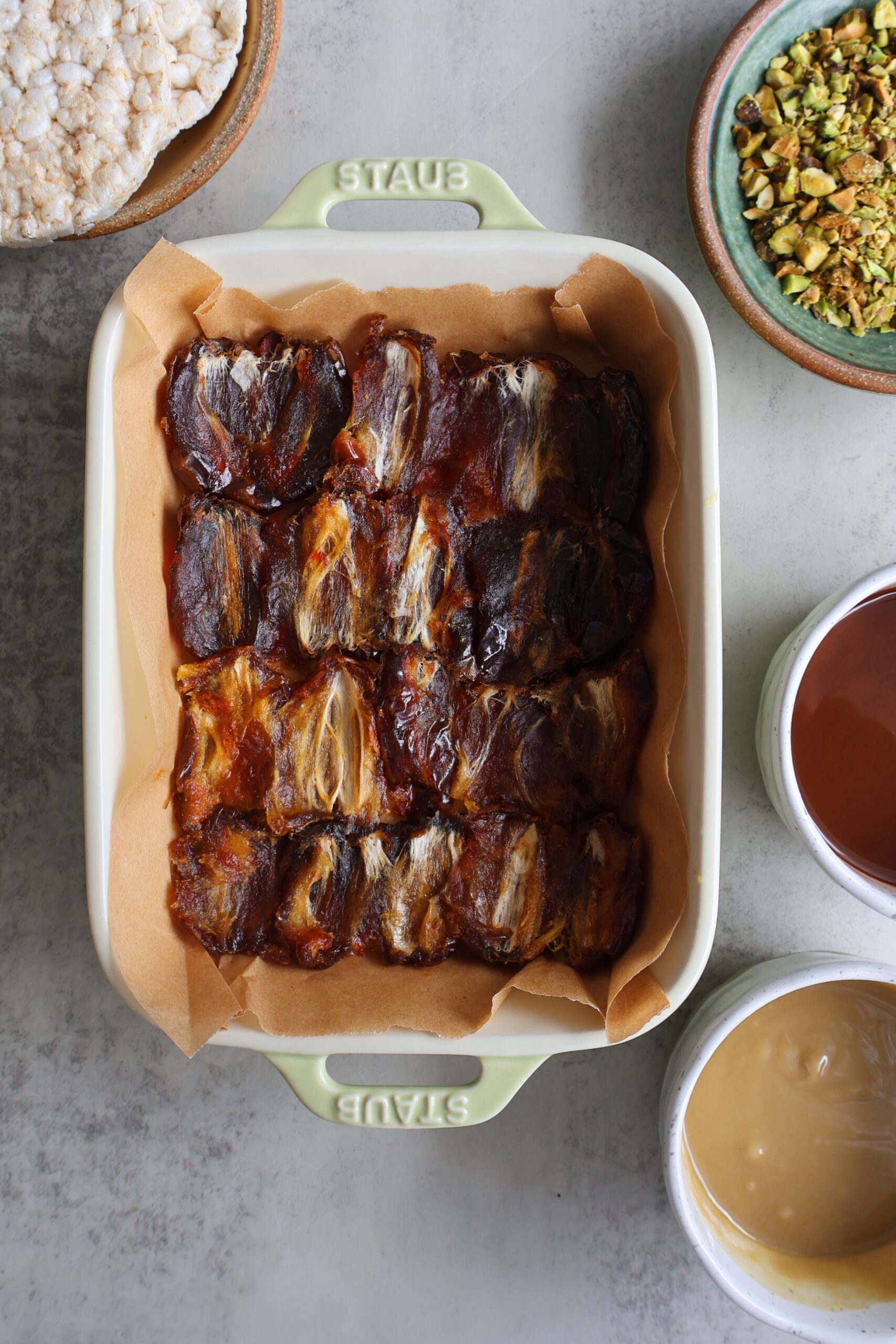- Next, whisk the tahini and maple syrup with a pinch of salt to create the creamy tahini layer. Pour that over the dates