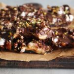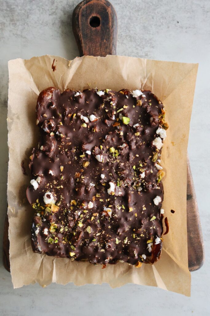 - Pour the melted chocolate over the top, with some extra pistachios and flakey salt.