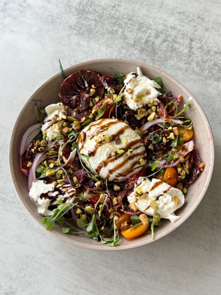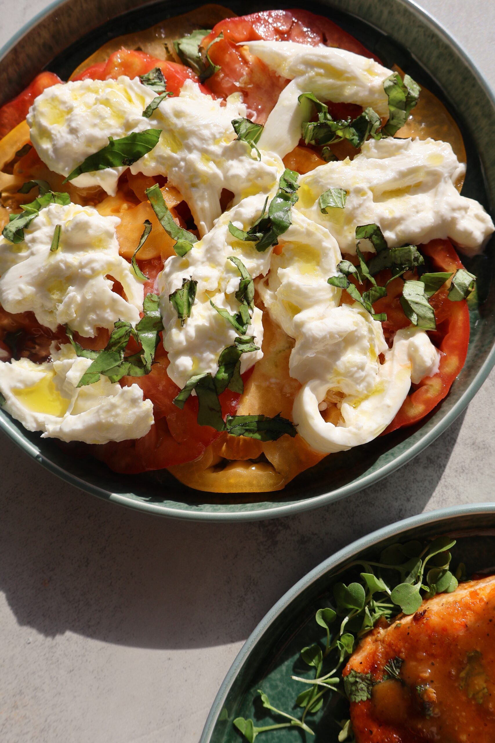 That’s all! Simply layer the tomatoes on a plate and top with the burrata. Give it a drizzle of olive oil, flakey salt and top with chopped basil.