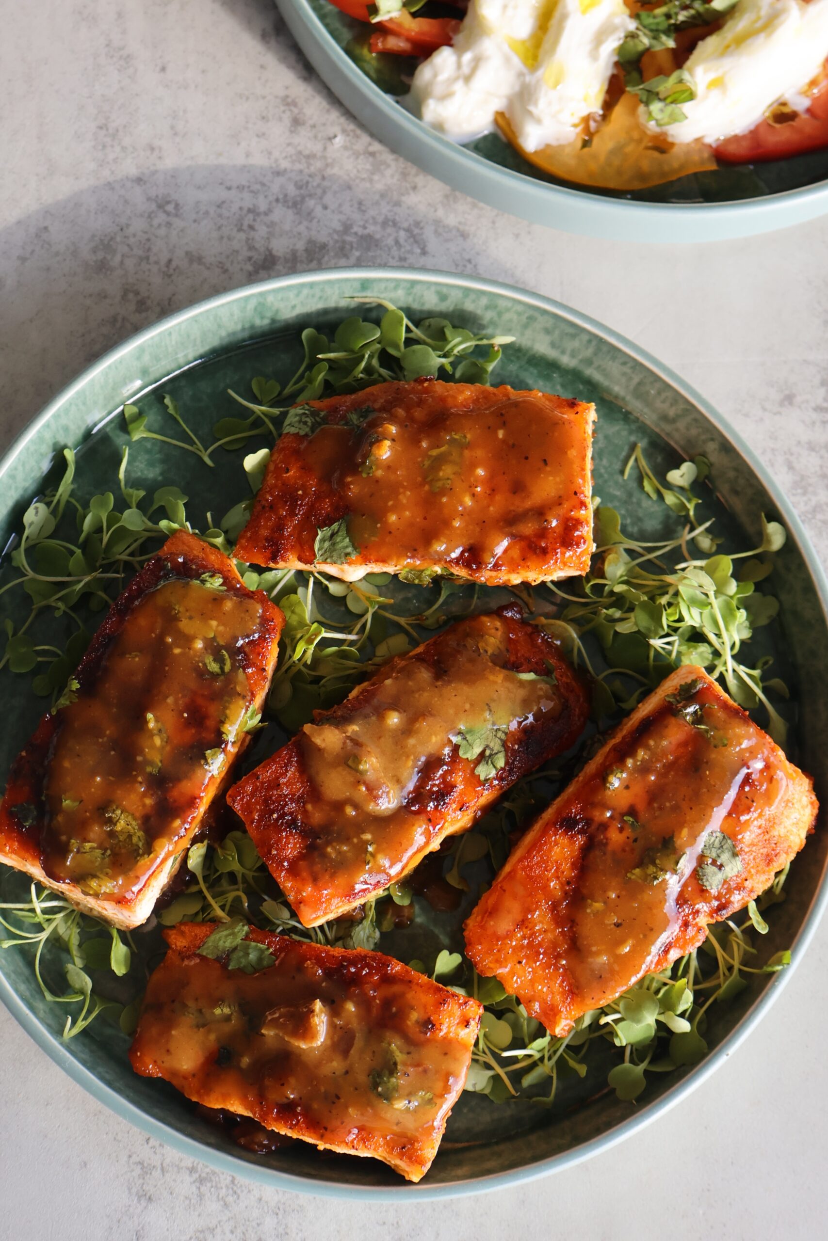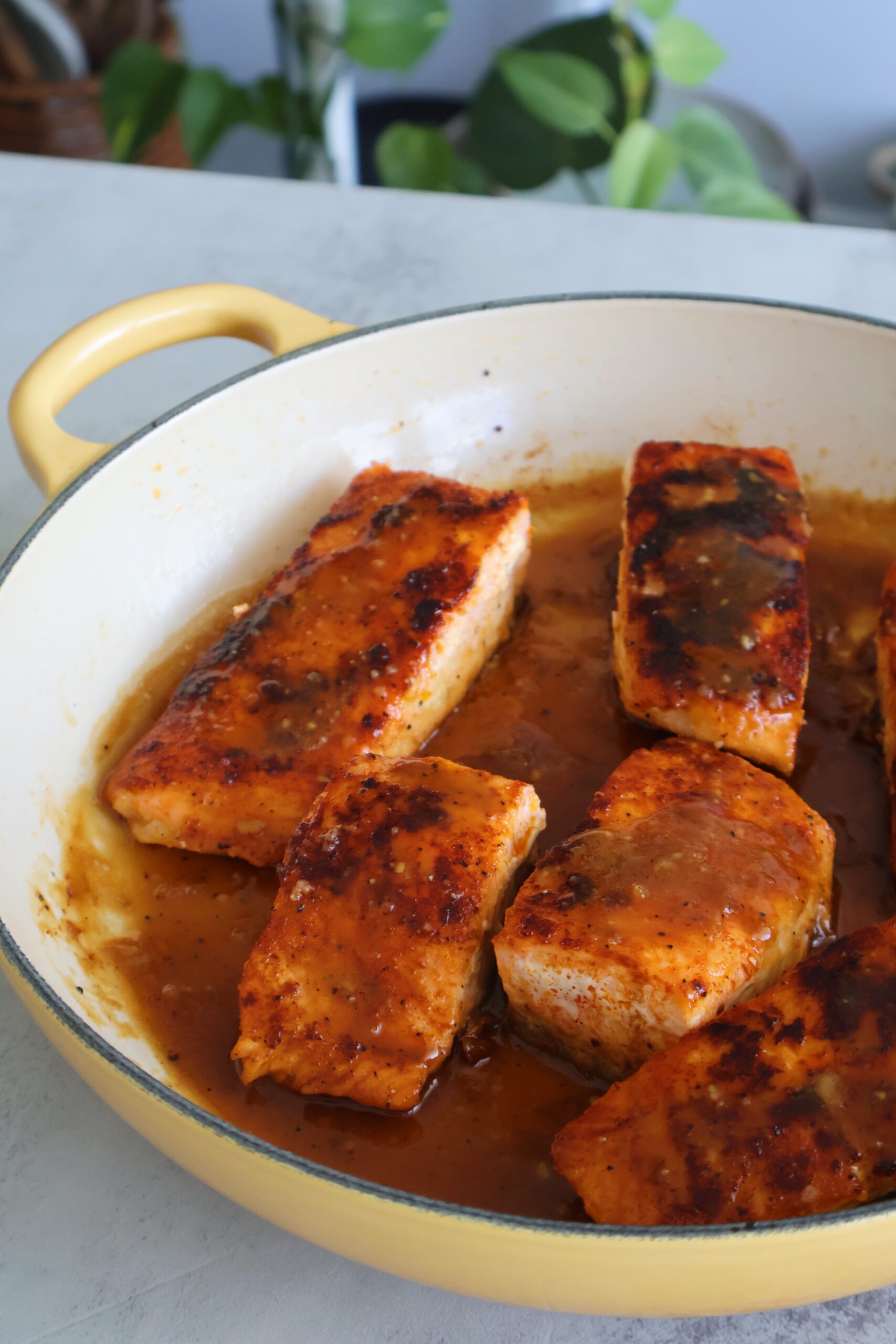 - Place the salmon fillets back into the pan and pour the marinade on top. Let the sauce simmer on low until it thickens, then spoon it over the fish