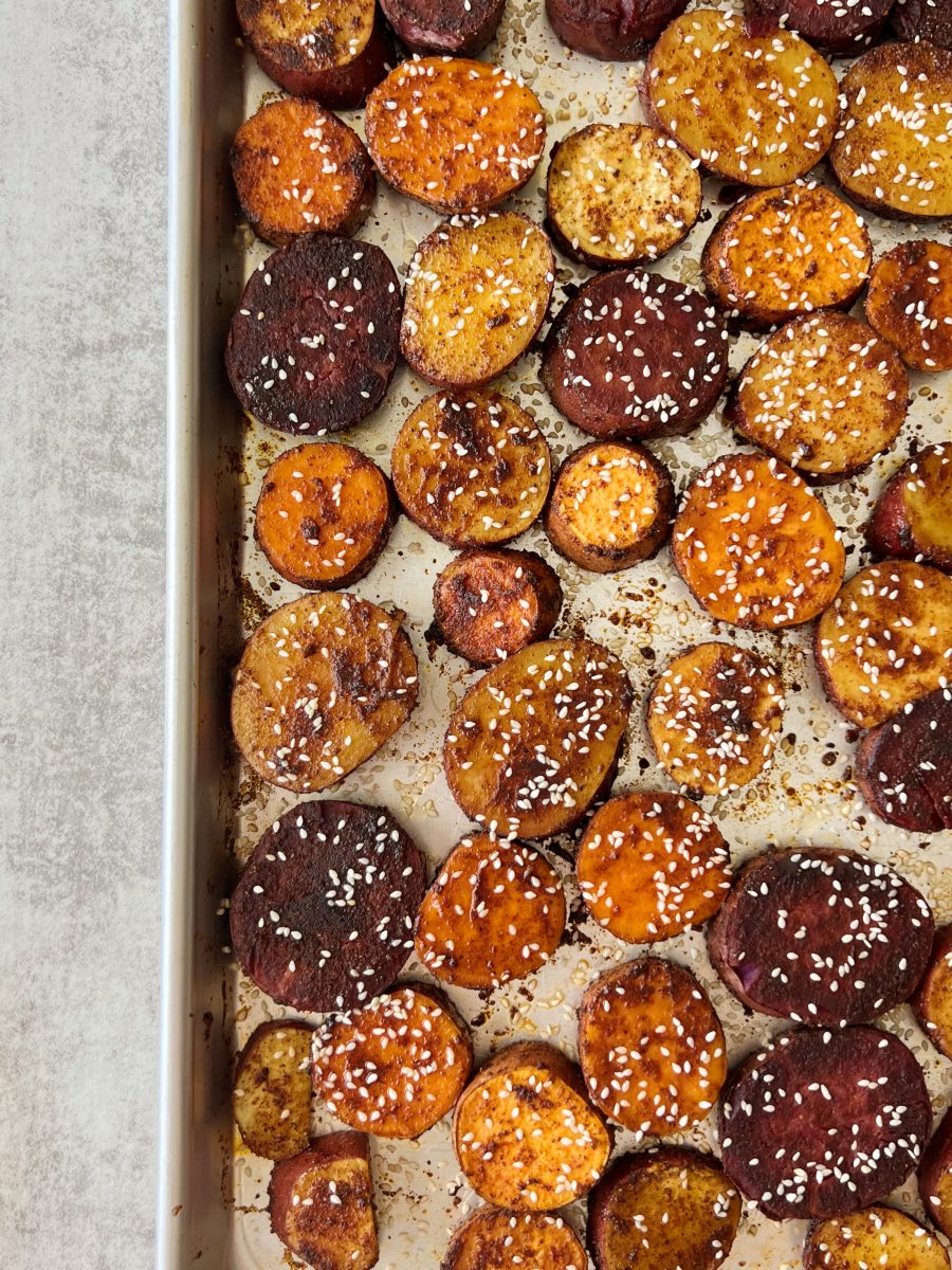 These tri-color sweet potatoes are baked with chipotle powder, garlic powder and salt & pepper, then finished off with a drizzle of honey and some sesame seeds. I love serving them over yogurt or whipped feta with a drizzle of tahini sauce.