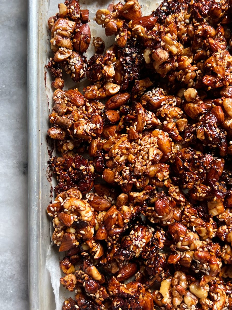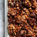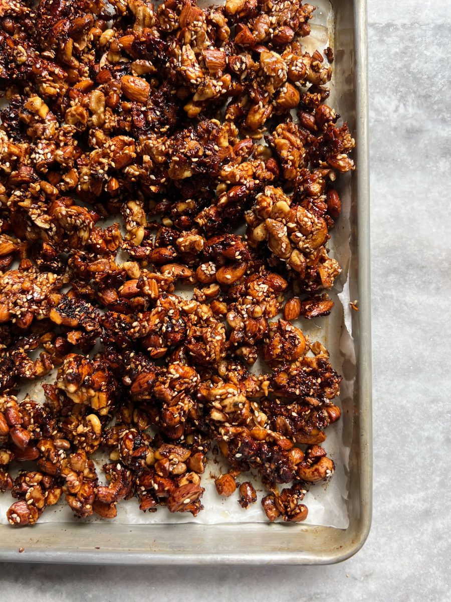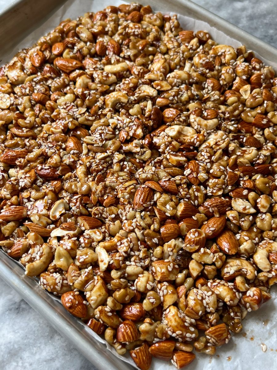 The nuts and seeds get mixed together with date syrup and coconut oil, and come out so crisp and crunchy.